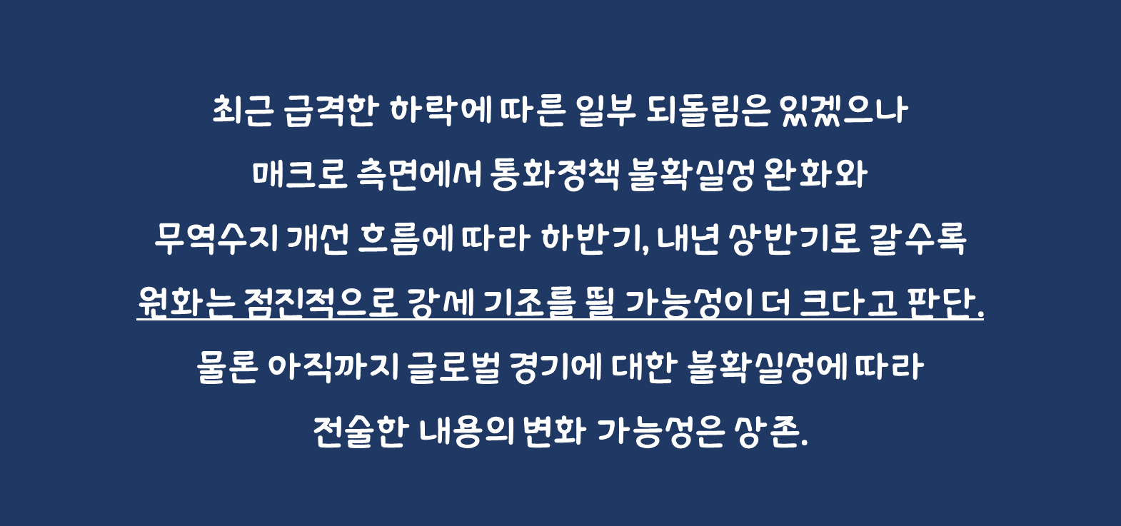 • 최근 급격한 하락에 따른 일부 되돌림은 있겠으나 매크로 측면에서 통화정책 불확실성 완화와 무역수지 개선 흐름에 따라 하반기, 내년 상반기로 갈수록 원화는 점진적으로 강세 기조를 띌 가능성이 더 크다고 판단. 물론 아직까지 글로벌 경기에 대한 불확실성에 따라 전술한 내용의 변화 가능성은 상존.