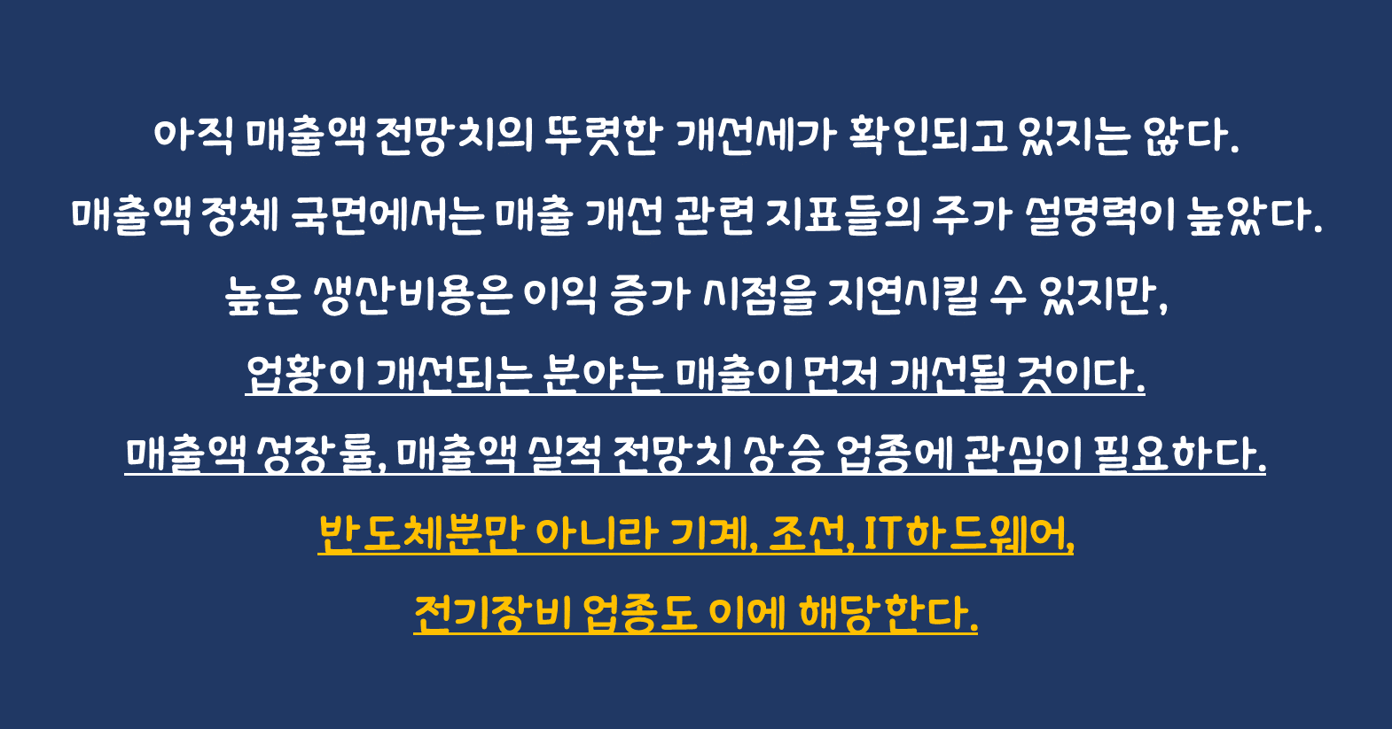 한편, 아직 매출액 전망치의 뚜렷한 개선세가 확인되고 있지는 않다. 매출액 정체 국면에서는 매출 개선 관련 지표들의 주가 설명력이 높았다. 높은 생산비용은 이익 증가 시점을 지연시킬 수 있지만, 업황이 개선되는 분야는 매출이 먼저 개선될 것이다. 매출액 성장률, 매출액 실적 전망치 상승 업종에 관심이 필요하다. 반도체뿐만 아니라 기계, 조선, IT하드웨어, 전기장비 업종도 이에 해당한다.