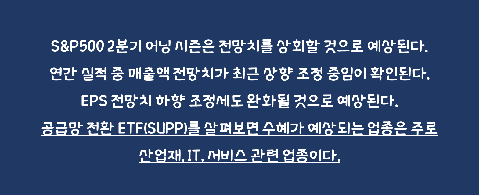 AI, 공급망 재편, 리오프닝 이슈가 실적 가이던스와 컨센서스의 상향 조정을 주도하고 있다. 미국 중심의 AI 투자 수요 확대와 공급망 재편은 향후에도 미국 기업들의 실적 모멘텀에 지속적인 영향을 미칠 것으로 예상된다. 공급망 전환 ETF(SUPP)를 살펴보면 수혜가 예상되는 업종은 주로 산업재, IT, 서비스 관련 업종이다.