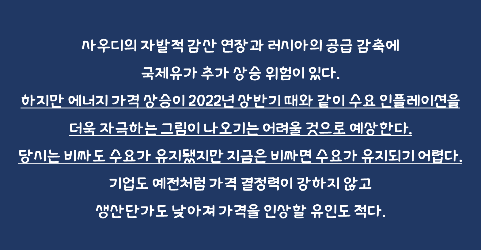 사우디의 자발적 감산 연장과 러시아의 공급 감축에 국제유가 추가 상승 위험이 있다. 현재까지 월평균 미국 휘발유 가격은 전년 대비 여전히 마이너스지만 그 폭이 빠르게 축소되고 있다. 7월까진 영향이 제한됐지만 앞으로 에너지 가격 반등의 CPI 영향이 본격화되고 이르면 8월에 에너지 항목의 전년 대비 CPI 상승률 기여도가 플러스로 전환될 수 있다. 이는 헤드라인 인플레이션 반등 폭을 확대시키고 시차를 두고 근원항목 가격도 자극할 수 있다는 우려로 이어질 수 있다. 하지만 에너지 가격 상승이 2022년 상반기 때와 같이 수요 인플레이션을 더욱 자극하는 그림이 나오기는 어려울 것으로 예상한다. 당시는 비싸도 수요가 유지됐지만 지금은 비싸면 수요가 유지되기 어렵다. 은행 대출 조건이 긴축되고 있고 학자금 대출 상환도 재개되는 가운데 높아진 에너지 가격은 나머지 소비지출을 구축할 수 있다. 기업도 예전처럼 가격 결정력이 강하지 않고 생산단가도 낮아져 가격을 인상할 유인도 적다. 우리는 에너지 가격 반등이 지금의 디스플레이션 추세를 뒤바꿀 정도는 아닐 것으로 본다.