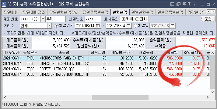 1) 6월 셋째 주입니다. 셋째 주 첫 시작 월요일 아주 난리가 났었네요. 덩치를 키워오던 FNGU, TQQQ를 모두 매도했고, 추가로 가벼운 아이들 TECL, WEBL까지 하루에 모두 매도 가능했습니다. (+10% 수익률)