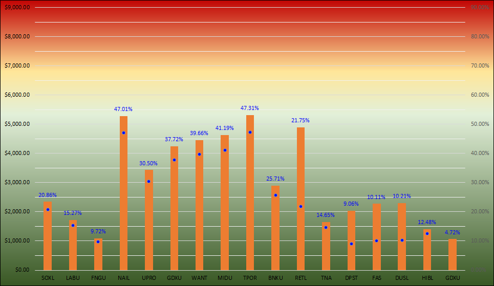 3) 대신 HIBL(DIREXION DAILY S&P 500 HIGH BETA BULL 3)을 신규 편입했고 남는 시드는 바로 직전에 새로 시작한 아이들인 DPST, FAS, DUSL에 추가 할당해 줬습니다.