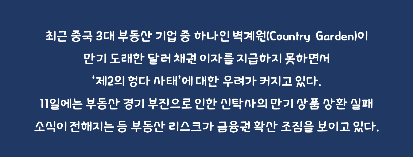 Country Garden과 국유 부동산 기업 디폴트 사태 발생. 부동산 리스크 금융권 확산 조짐 보여