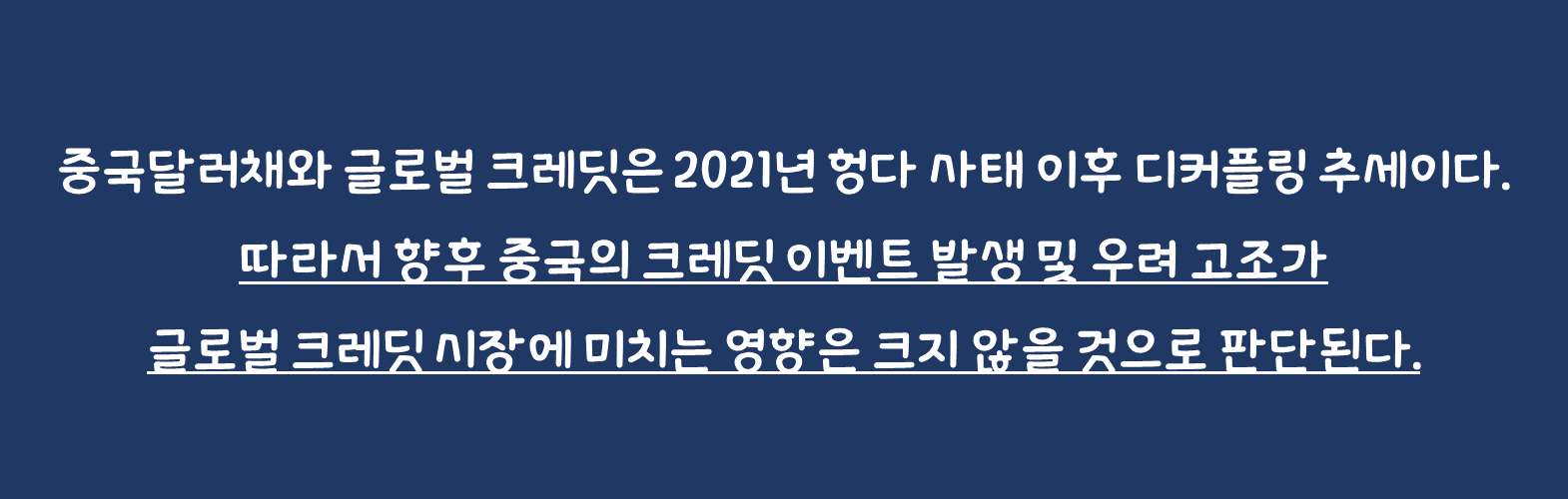 향후 중국 기업들의 자금 조달이 더욱 어려워지며 부도 사례가 증가할 것으로 예상된다. 중국 중앙 정부는 이를 디레버리징 및 산업 내 구조조정의 기회로 활용하여, 대형 국유기업과 상대적으로 견고한 지방 정부 산하 기업을 선별하여 지원할 가능성이 높다. 중국달러채와 글로벌(선진국 및 신흥국 모두) 크레딧은 2021년 헝다 사태 이후 디커플링 추세이다. 1)신흥국 채권 지표에서 중국물이 제외, 2)중국물에 대한 글로벌 투자 수요가 크게 낮아졌기 때문이다. 따라서 향후 중국의 크레딧 이벤트 발생 및 우려 고조가 글로벌 크레딧 시장에 미치는 영향은 크지 않을 것으로 판단된다.