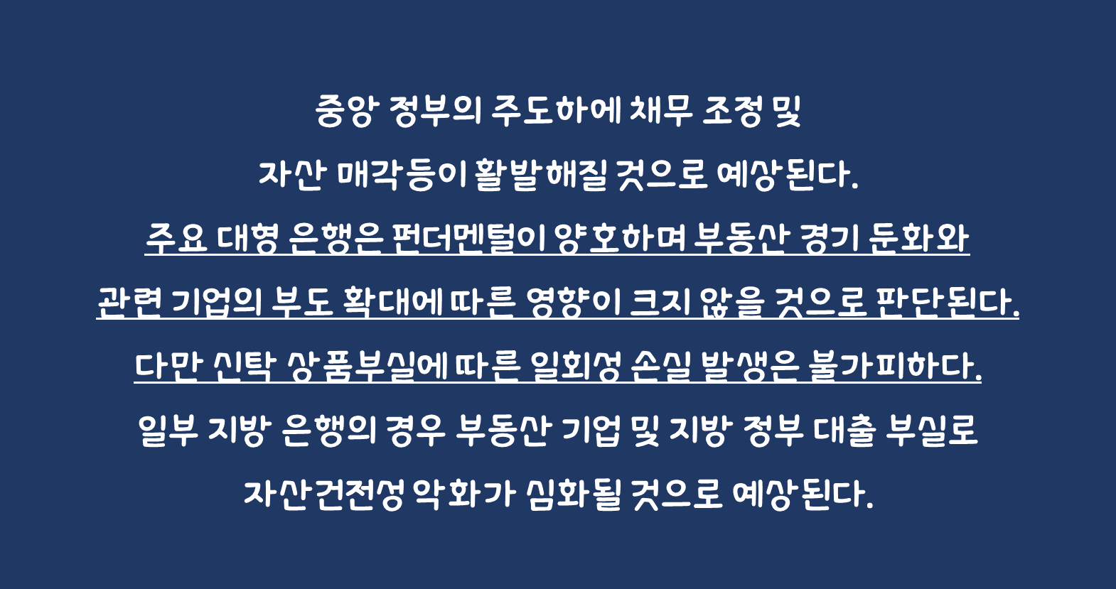 중국의 크레딧 이슈는 부동산 기업에만 국한되지 않는다. LGFV(지방정부자금조달기구)에 대한 우려는 과거에도 존재하였으나, 코로나 이후 크게 늘어난 부채와 수익성 저하 및 자금 조달 난항 등을 감안하면 더욱 경계가 필요하다. 일부 지방 정부의 경우 재정약화로 LGFV에 대한 지원 여력이 저하, 중앙 정부의 주도하에 채무 조정 및 자산 매각등이 활발해질 것으로 예상된다. 주요 대형 은행은 펀더멘털이 양호하며 부동산 경기 둔화와 관련 기업의 부도 확대에 따른 영향이 크지 않을 것으로 판단된다. 다만 신탁 상품부실에 따른 일회성 손실 발생은 불가피하다. 일부 지방 은행의 경우 부동산 기업 및 지방 정부 대출 부실로 자산건전성 악화가 심화될 것으로 예상된다.