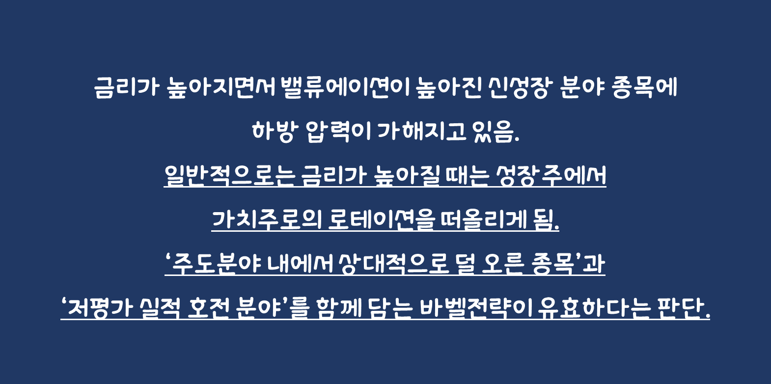 최근 금리가 높아지면서 밸류에이션이 높아진 신성장 분야 종목에 하방 압력이 가해지고 있습니다. 어떤 투자전략으로 대응해야할 지 점검해 보았습니다.