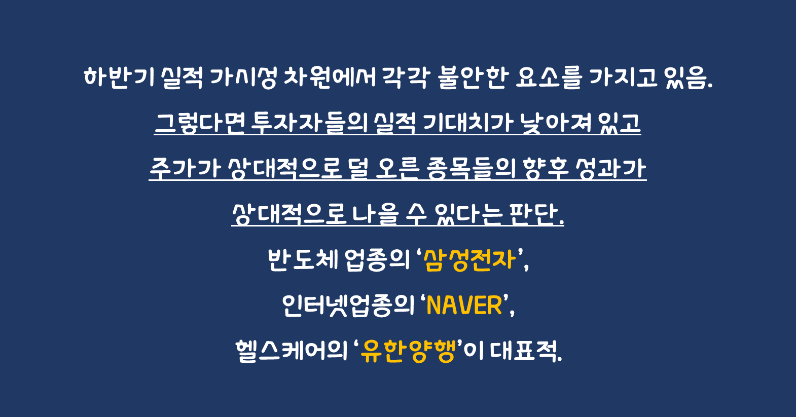 올해 주식시장의 주도주는 반도체와 2차전지. 그리고 최근 들어 인터넷과 헬스케어가 주도주에 합류하는 양상. 이들 분야는 하반기 실적 가시성 차원에서 각각 불안한 요소를 가지고 있음. 그렇다면 투자자들의 실적 기대치가 낮아져 있고 주가가 상대적으로 덜 오른 종목들의 향후 성과가 상대적으로 나을 수 있다는 판단. 반도체 업종의 ‘삼성전자’, 인터넷업종의 ‘NAVER’, 헬스케어의 ‘유한양행’이 대표적.