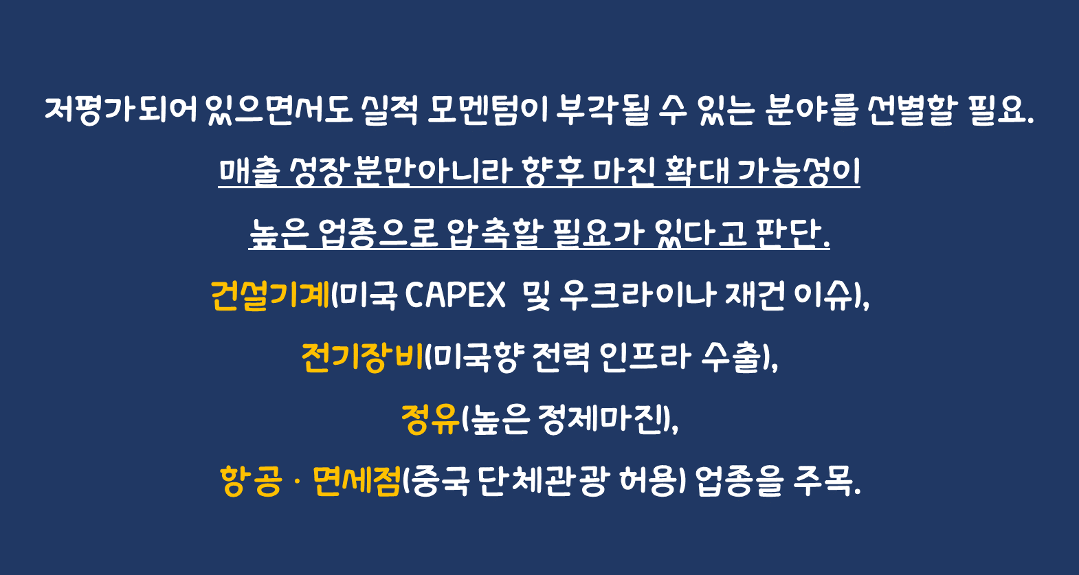 스타일 로테이션이 광범위하고 강하게 진행되지 않는다면, 단순히 저평가된 종목이 아니라 저평가되어 있으면서도 실적 모멘텀이 부각될 수 있는 분야를 선별할 필요. 매출 성장뿐만아니라 향후 마진 확대 가능성이 높은 업종으로 압축할 필요가 있다고 판단. 건설기계(미국 CAPEX 및 우크라이나 재건 이슈), 전기장비(미국향 전력 인프라 수출), 정유(높은 정제마진), 항공·면세점(중국 단체관광 허용) 업종을 주목.
