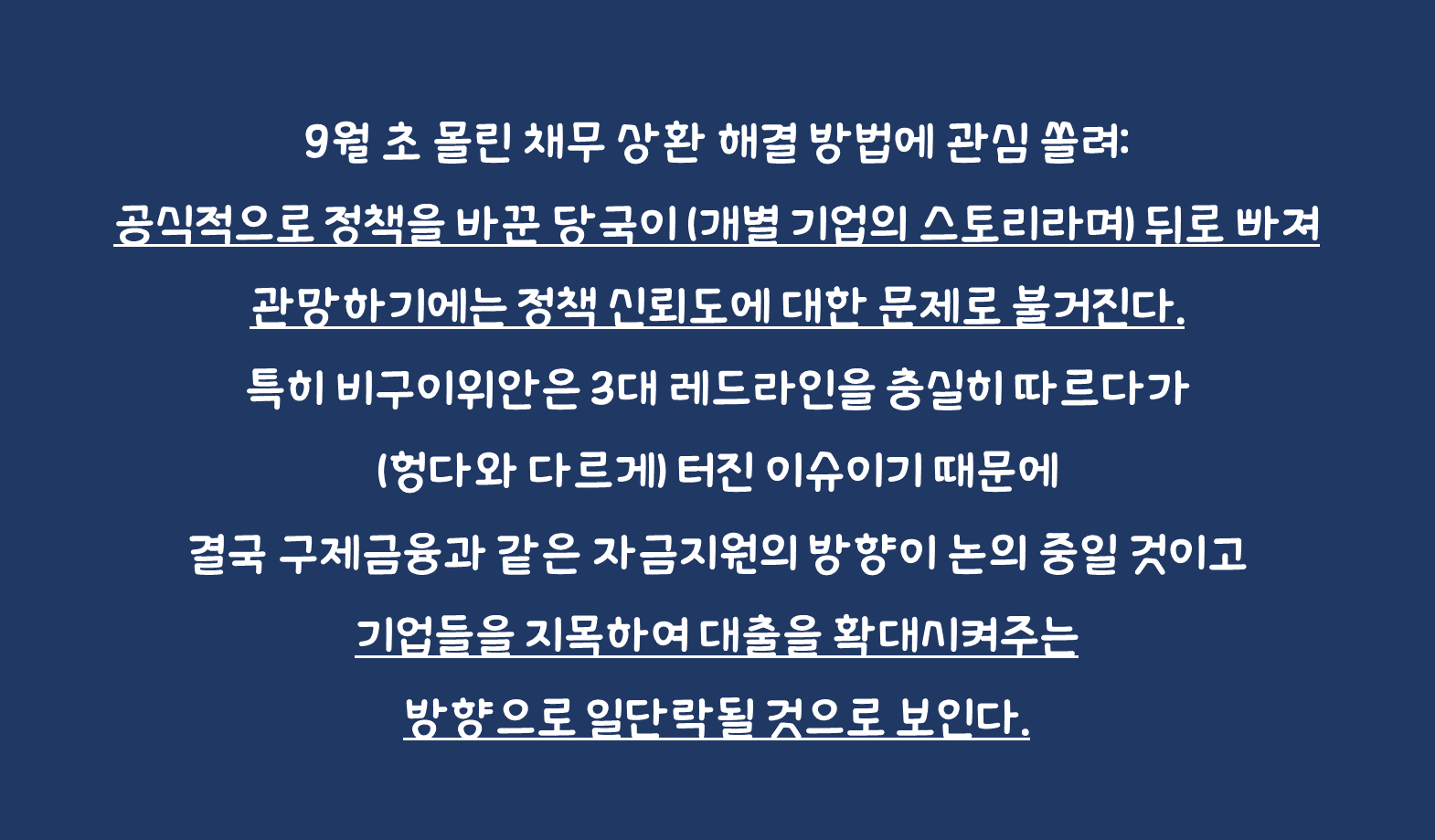 채무상환 만기까지 자생적으로 부동산 판매가 호전되어 자금이 융통되긴 어려운 상황이다. 그렇다고 공식적으로 정책을 바꾼 당국이 (개별 기업의 스토리라며) 뒤로 빠져 관망하기에는 정책 신뢰도에 대한 문제로 불거진다. 특히 비구이위안은 3대 레드라인을 충실히 따르다가 (헝다와 다르게) 터진 이슈이기 때문에 결국 구제금융과 같은 자금지원의 방향이 논의 중일 것이고 기업들을 지목하여 대출을 확대시켜주는 방향으로 일단락될 것으로 보인다. 참고로 비구이위안은 9월 2일 채무에 대해 3년 할부납부를 제시했고, 투자자들의 협의가 25일까지 진행된다.