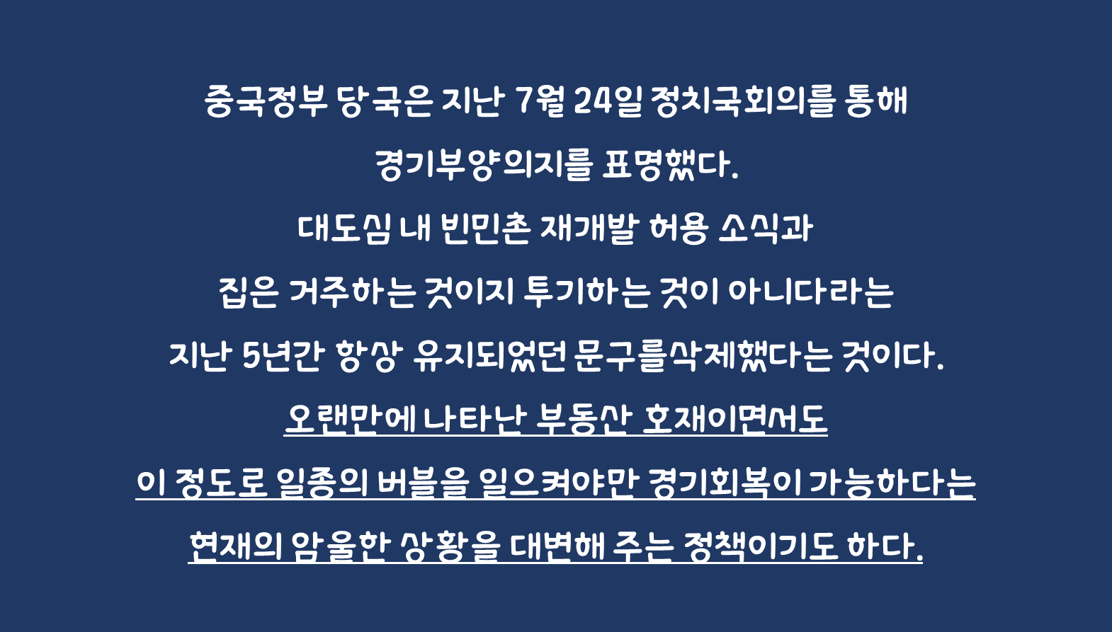 중국정부 당국은 지난 7월 24일 정치국회의를 통해 경기부양의지를 표명했다. 이 회의에서 특히 강조된 상황은 인구 500만명 이상 사는 대도심 내 빈민촌 재개발 허용 소식과 집은 거주하는 것이지 투기하는 것이 아니다라는 지난 5년간 항상 유지되었던 문구를 삭제했다는 것이다. 특히 도심 속 빈민촌 재개발은 준공에만 집중해온 중국정부의 재개발 및 착공 강조 정책으로 이 정책을 내년의 최우선 과제로 삼을 것이나 착공 준비가 된 지역은 올해부터 착공을 시작하길 촉구한다고 언급했다. 오랜만에 나타난 부동산 호재이면서도 이 정도로 일종의 버블을 일으켜야만 경기회복이 가능하다는 현재의 암울한 상황을 대변해 주는 정책이기도 하다. 정확히 부양기조를 언급한지 열흘 남짓 흐른 시점부터는 비구이위안 회사채 이자 미지급 소식이 시장을 물들였으며, 이는 신탁회사들의 상품 환매 중단소식 등까지 이어지며 중국의 잃어버린 30년, 40년 우려까지 자아내고 있다.