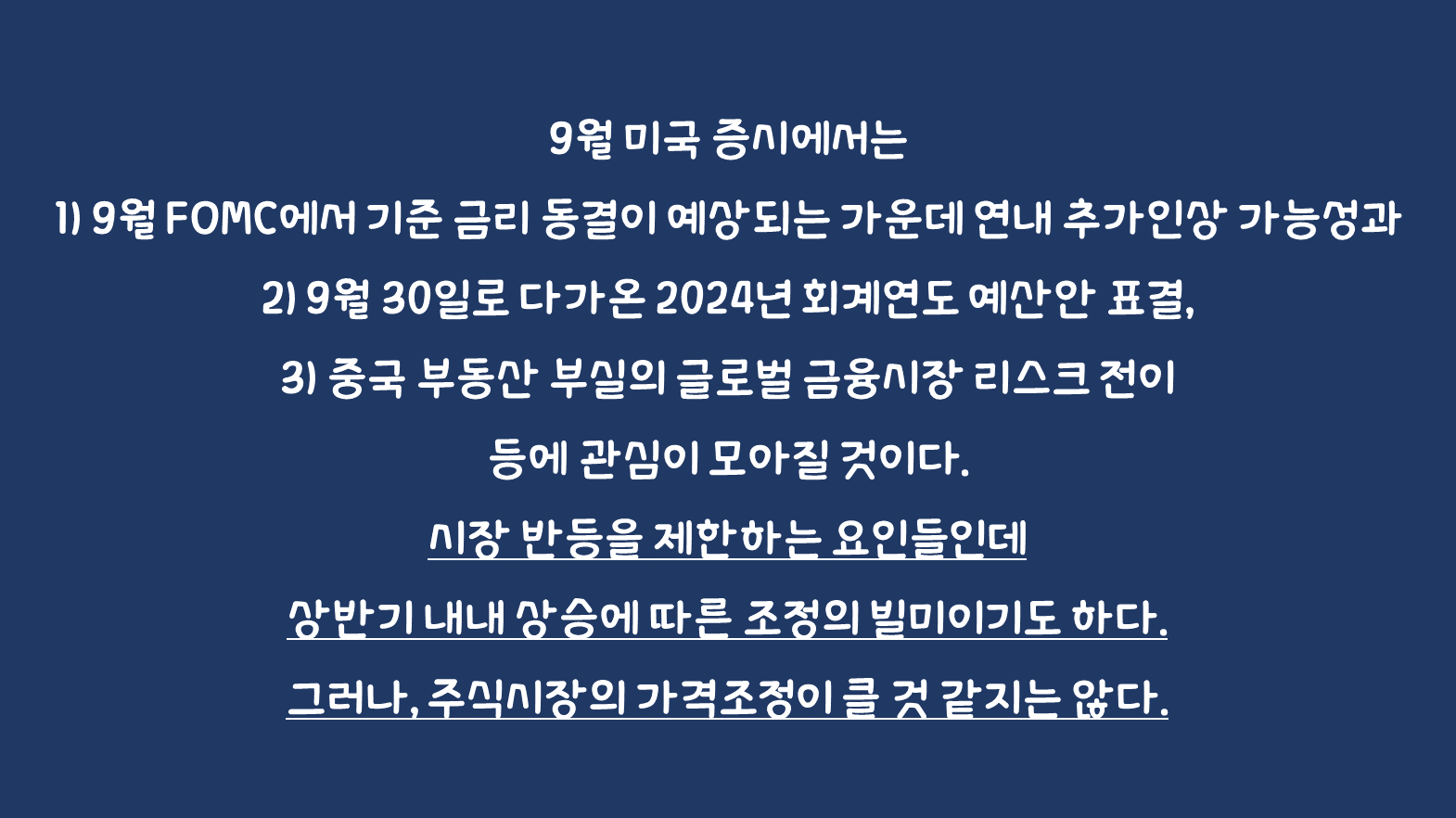 9월 미국 증시에서는 1) 9월 FOMC에서 기준 금리 동결이 예상되는 가운데 연내 추가인상 가능성과 2) 9월 30일로 다가온 2024년 회계연도 예산안 표결, 3) 중국 부동산 부실의 글로벌 금융시장 리스크 전이 등에 관심이 모아질 것이다. 시장 반등을 제한하는 요인들인데 상반기 내내 상승에 따른 조정의 빌미이기도 하다. 그러나, 주식시장의 가격조정이 클 것 같지는 않다. 박스권의 하단을 확인하고 상단을 시도하는 흐름을 예상한다. 미국 경기에 대한 우려는 약해지고, 기업 이익은 3분기부터 전년대비 증가세로 전환(3분기 +1.5%, 4분기 9.2%, 2024년 1분기 +9.5%, 2분기 +12.3% y-y)할 것으로 추정되기 때문이다.