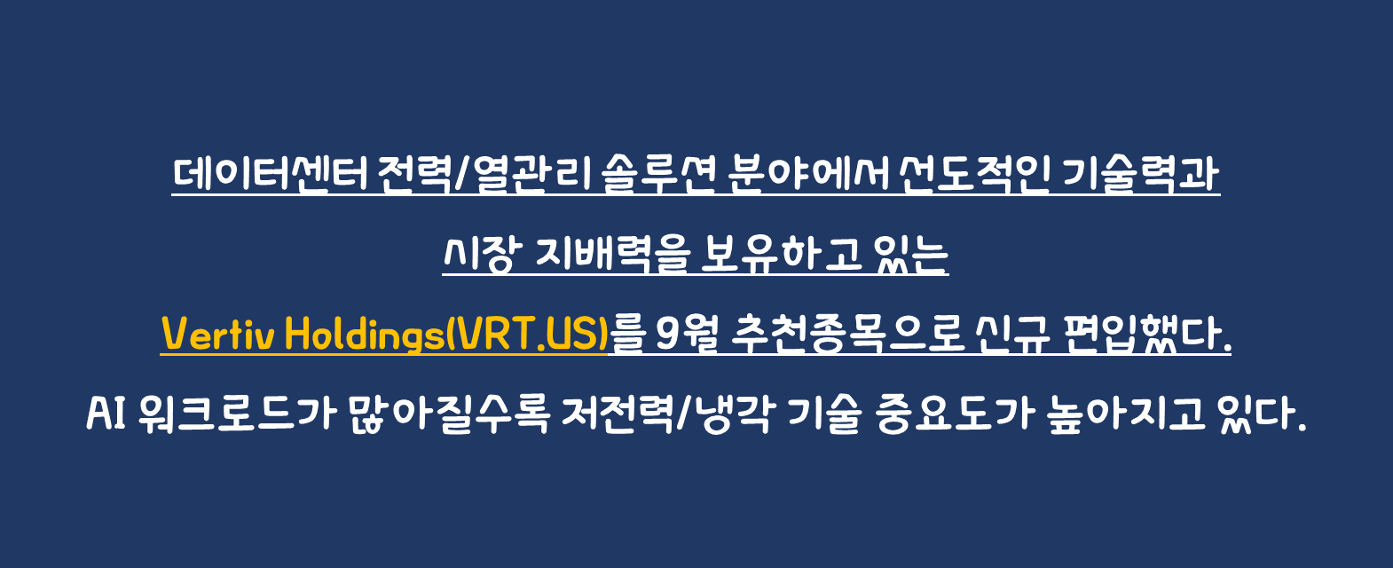 데이터센터 전력/열관리 솔루션 분야에서 선도적인 기술력과 시장 지배력을 보유하고 있는 Vertiv Holdings(VRT.US)를 9월 추천종목으로 신규 편입했다. AI 워크로드가 많아질수록 저전력/냉각 기술 중요도가 높아지고 있다. 또한 금속가격이 하락하면서 원가율이 개선되 이익 레버리지 효과도 극대화되고 있다.