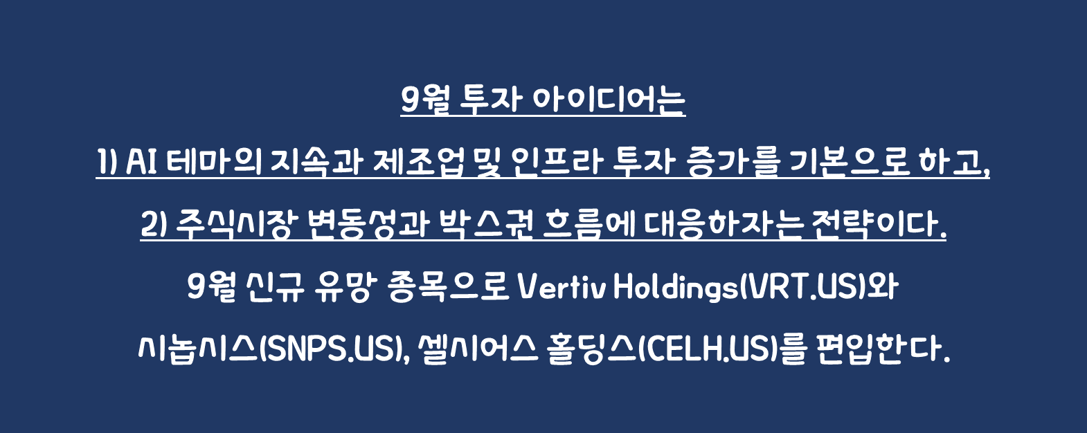 기본적인 투자 아이디어로 테마가 지속될 것으로 기대되는 AI 기업(엔비디아, 마이크로소프트, 시놉시스)과 공급망 재편, 미국 제조업 및 인프라 투자 증가의 수혜주 (파커-하니핀, 로크웰 오토메이션)를 유지한다. 시장 변동성을 고려한다면 확고한 영업기반에서 우월적인 지위와 신제품 성장 전략을 펴고 있는 대형 우량기업 (일라이 릴리, 월마트)가 대안이다. 한편, 9월 미국 주식시장은 박스권 흐름을 예상하며 추세 하락으로의 전환 가능성은 낮다고 판단해 우호적 영업환경에서 고성장이 기대되는 중소형주(Vertiv Holdings, 셀시어스 홀딩스)를 편입했다.