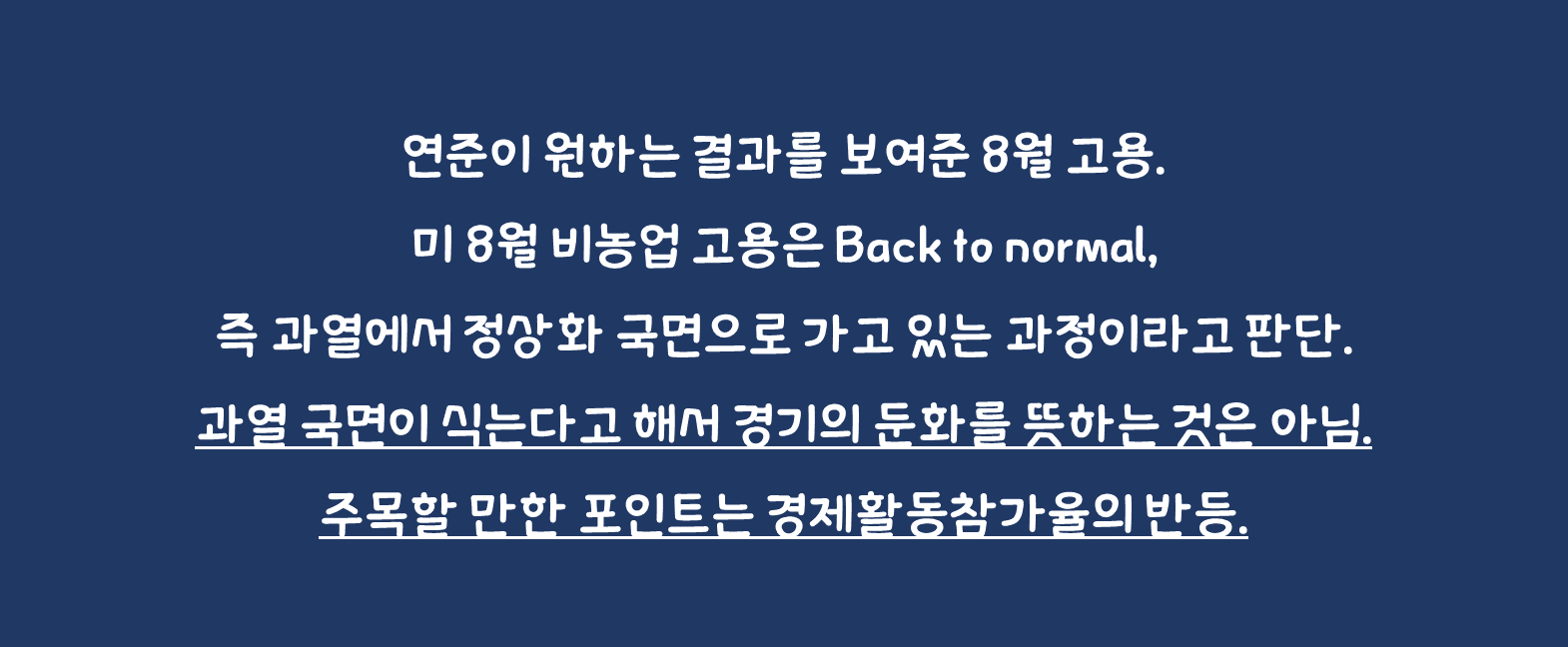 • 연준이 원하는 결과를 보여준 8월 고용. 미 8월 비농업 고용은 Back to normal, 즉 과열에서 정상화 국면으로 가고 있는 과정이라고 판단. 과열 국면이 식는다고 해서 경기의 둔화를 뜻하는 것은 아님.