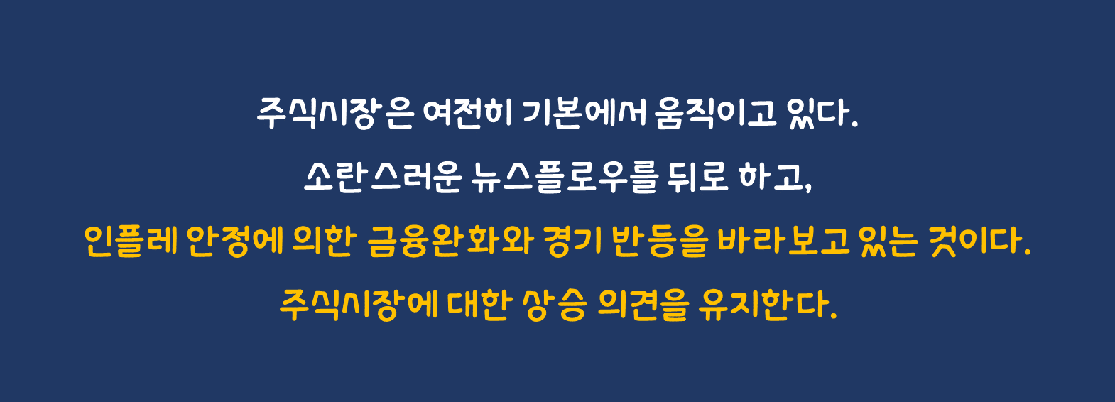 주식시장은 여전히 기본에서 움직이고 있다. 소란스러운 뉴스플로우를 뒤로 하고, 인플레 안정에 의한 금융완화와 경기 반등을 바라보고 있는 것이다. (이에 대해서는 직전까지의 자료에서 반복 설명했기에 이것으로 갈음한다.) 주식시장에 대한 상승 의견을 유지한다.