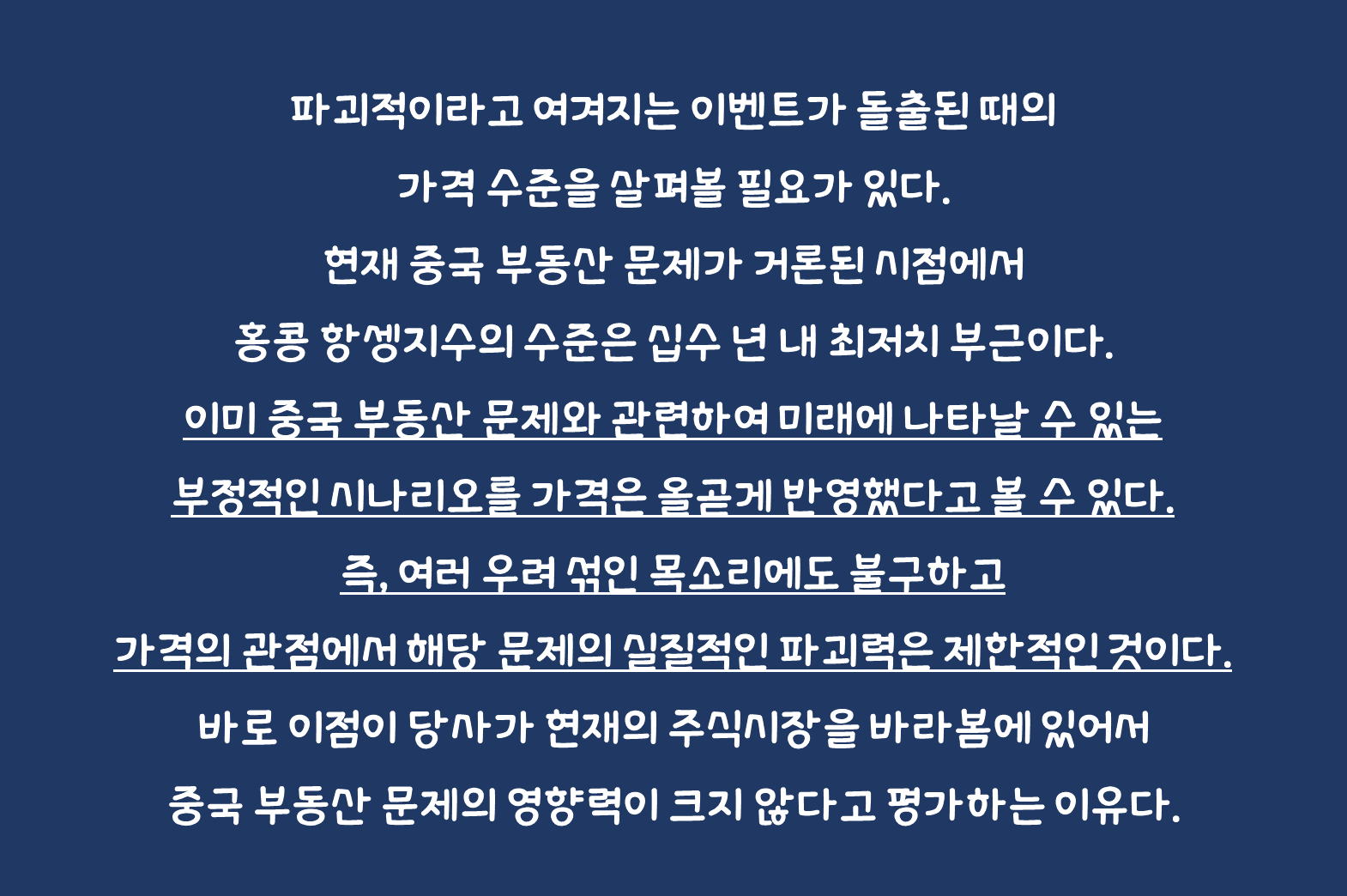 다만, 파괴적이라고 여겨지는 이벤트가 돌출된 때의 가격 수준을 살펴볼 필요가 있다. 현재 중국 부동산 문제가 거론된 시점에서 홍콩 항셍지수의 수준은 십수 년 내 최저치 부근이다. (중국의 제반 문제를 진단함에 있어서 상해종합지수는 적절한 도구가 아니라고 판단한다. 이것이 경기를 반영하는 기능은 팬데믹 당시부터 약화됐다. 반면, 홍콩 항셍지수는 그 기능을 일정 부분 보전하고 있다.) 이는 과거 15년 전 금융위기 당시 미국 부동산 문제와 연동하여 리먼 사태가 발생했을 때 미국 주가 수준이 역사상 최고치 부근이었던 것과 대조를 이룬다. 이미 중국 부동산 문제와 관련하여 미래에 나타날 수 있는 부정적인 시나리오를 가격은 올곧게 반영했다고 볼 수 있다. 즉, 여러 우려 섞인 목소리에도 불구하고 가격의 관점에서 해당 문제의 실질적인 파괴력은 제한적인 것이다. 바로 이점이 당사가 현재의 주식시장을 바라봄에 있어서 중국 부동산 문제의 영향력이 크지 않다고 평가하는 이유다.