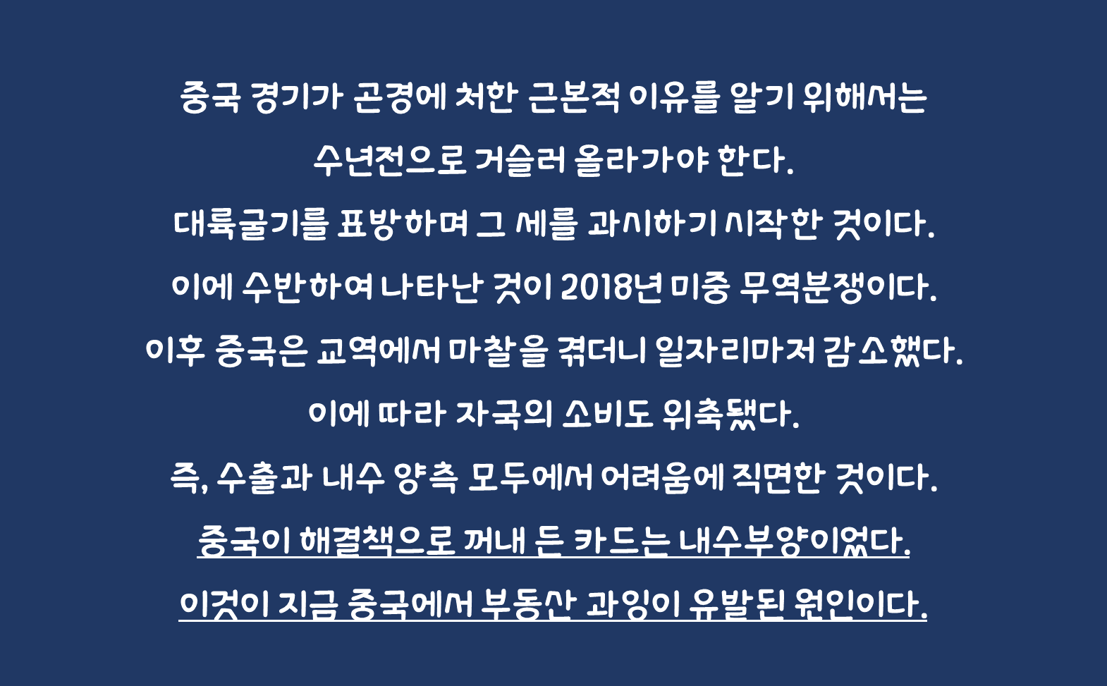 일단 중국이 당면한 상황을 정리해 보자. 중국 경기가 곤경에 처한 근본적 이유를 알기 위해서는 수년전으로 거슬러 올라가야 한다. 중국의 대외 정책은 도광양회였다. 어둠 속에서 기회를 노리며 한껏 움츠리는 것이다. 이것이 시진핑 정권 들어 달라졌다. 대륙굴기를 표방하며 그 세를 과시하기 시작한 것이다. 이에 수반하여 나타난 것이 2018년 미중 무역분쟁이다. 이후 중국은 교역에서 마찰을 겪더니 일자리마저 감소했다. 이에 따라 자국의 소비도 위축됐다. 즉, 수출과 내수 양측 모두에서 어려움에 직면한 것이다. 중국이 해결책으로 꺼내 든 카드는 내수부양이었다. 이것이 지금 중국에서 부동산 과잉이 유발된 원인이다. 여기서 중국의 부동산과 소비의 연동성이 강화됐다는 점이 주요하다. 2019년 헝다 사태 당시 중국의 소비심리가 급강하하는 모습을 통하여 이를 유추할 수 있다. 올해 4월부터는 중국 국가통계국에서 소비심리지수에 대한 발표를 중단했다. 지금까지 중국의 통계 중단 사유를 통하여 짐작해 보건대 아마도 그들의 소비심리지수는 더욱 악화됐을 가능성이 높다. 한 마디로 중국 경기의 난점을 해결하기 위한 방안이 작동하지 않는 것이다. 이러한 시기에 중국 부동산 문제가 대두했다.