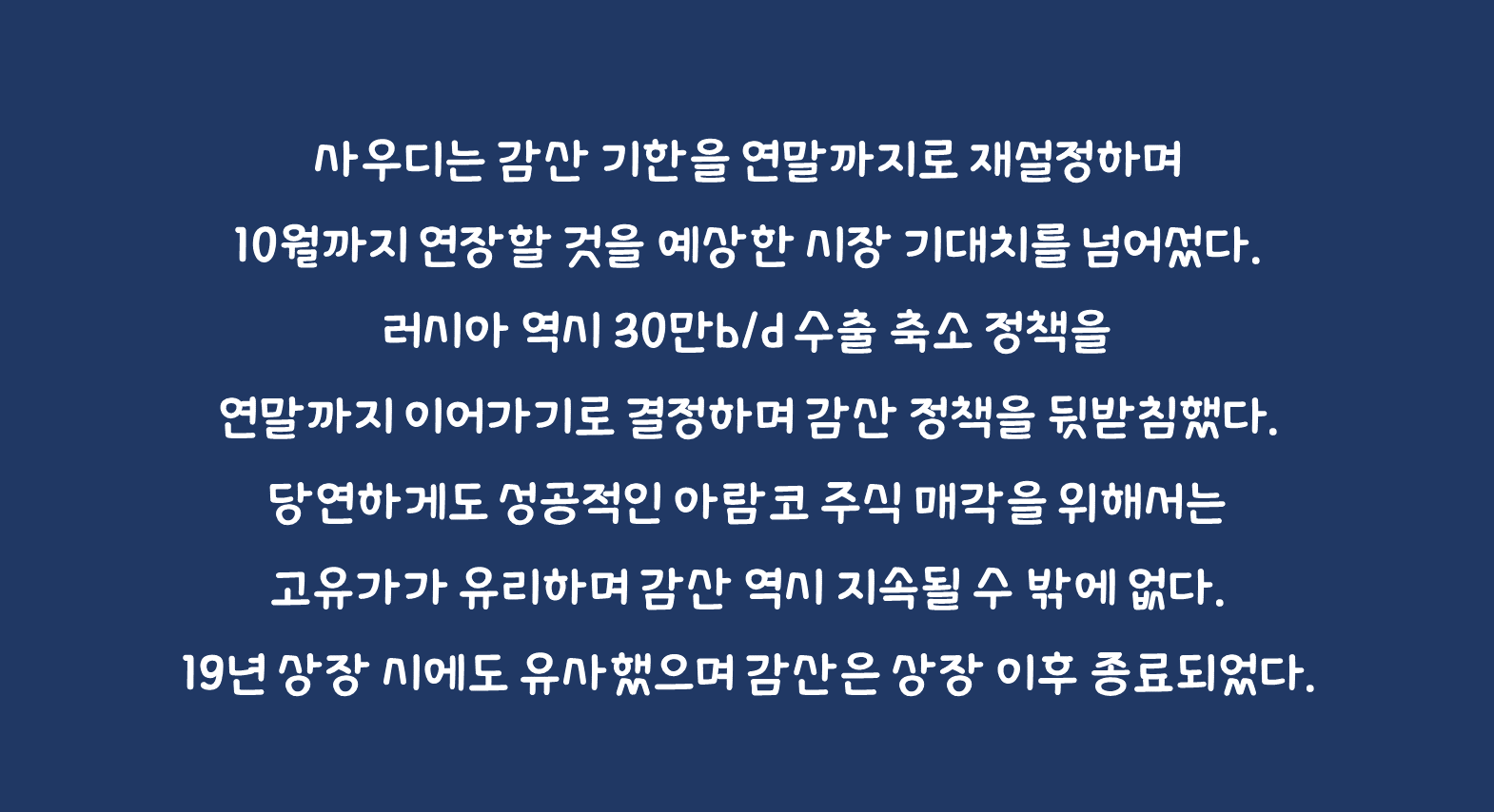 감산 결정에 앞서 지난 주말 사우디 국영 석유업체 아람코가 최대 500억 규모의 추가 주식 매각을 검토하고 있다는 월스트리트저널의 보도가 있었다. 19.12월 상장 당시 294억 매각했던 것을 감안하면 규모가 크다. 22년에도 매각 검토를 했었던 것을 감안하면 연기될 가능성을 배제할 수 없지만 만약 최종 결정이 이뤄지면 연내 매각이 진행될 것으로 예상하고 있다. 당연하게도 성공적인 아람코 주식 매각을 위해서는 고유가가 유리하며 감산 역시 지속될 수 밖에 없다. 19년 상장 시에도 유사했으며 감산은 상장 이후 종료되었다.