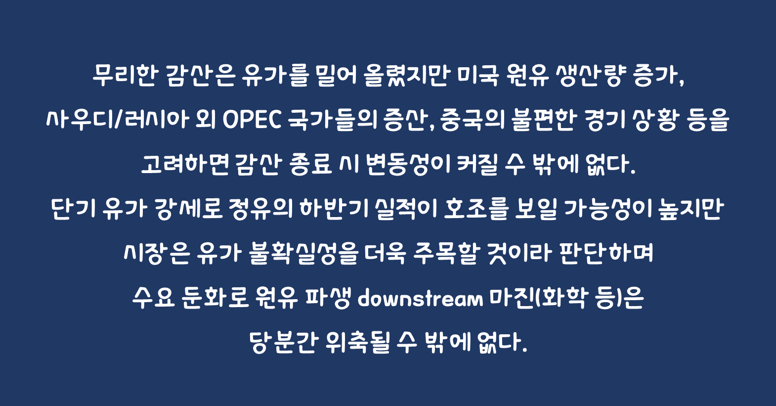 무리한 감산은 유가를 밀어 올렸지만 미국 원유 생산량 증가, 사우디/러시아 외 OPEC 국가들의 증산, 중국의 불편한 경기 상황 등을 고려하면 감산 종료 시 변동성이 커질 수 밖에 없다. 당초 4Q 이후 유가의 하방 변동성이 커질 것이라 예상했지만 그 시점을 연말 이후로 변경한다. 단기 유가 강세로 정유의 하반기 실적이 호조를 보일 가능성이 높지만 시장은 유가 불확실성을 더욱 주목할 것이라 판단하며 수요 둔화로 원유 파생 downstream 마진(화학 등)은 당분간 위축될 수 밖에 없다.
