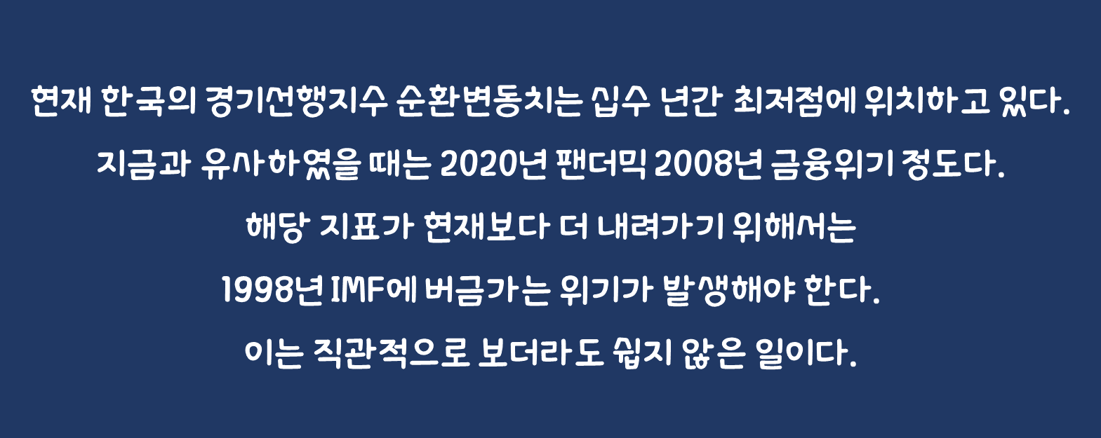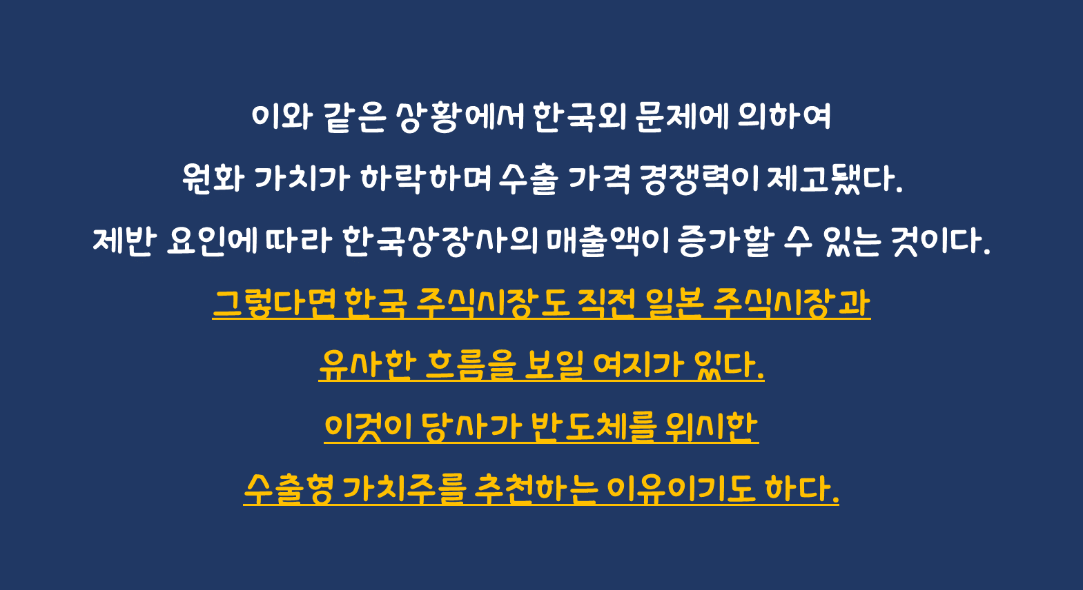 현재 한국의 경기선행지수 순환변동치는 십수 년간 최저점에 위치하고 있다. 지금과 유사하였을 때는 2020년 팬더믹 2008년 금융위기 정도다. 해당 지표가 현재보다 더 내려가기 위해서는 1998년 IMF에 버금가는 위기가 발생해야 한다. 이는 직관적으로 보더라도 쉽지 않은 일이다. 이와 같은 상황에서 한국외 문제에 의하여 원화 가치가 하락하며 수출 가격 경쟁력이 제고됐다. 더구나 지금은 잔존하는 인플레에 따라 저렴한 물품을 구매하고자 하는 글로벌 소비자들의 욕구가 높다. 제반 요인에 따라 한국상장사의 매출액이 증가할 수 있는 것이다. 그렇다면 한국 주식시장도 직전 일본 주식시장과 유사한 흐름을 보일 여지가 있다. 이것이 당사가 반도체를 위시한 수출형 가치주를 추천하는 이유이기도 하다.