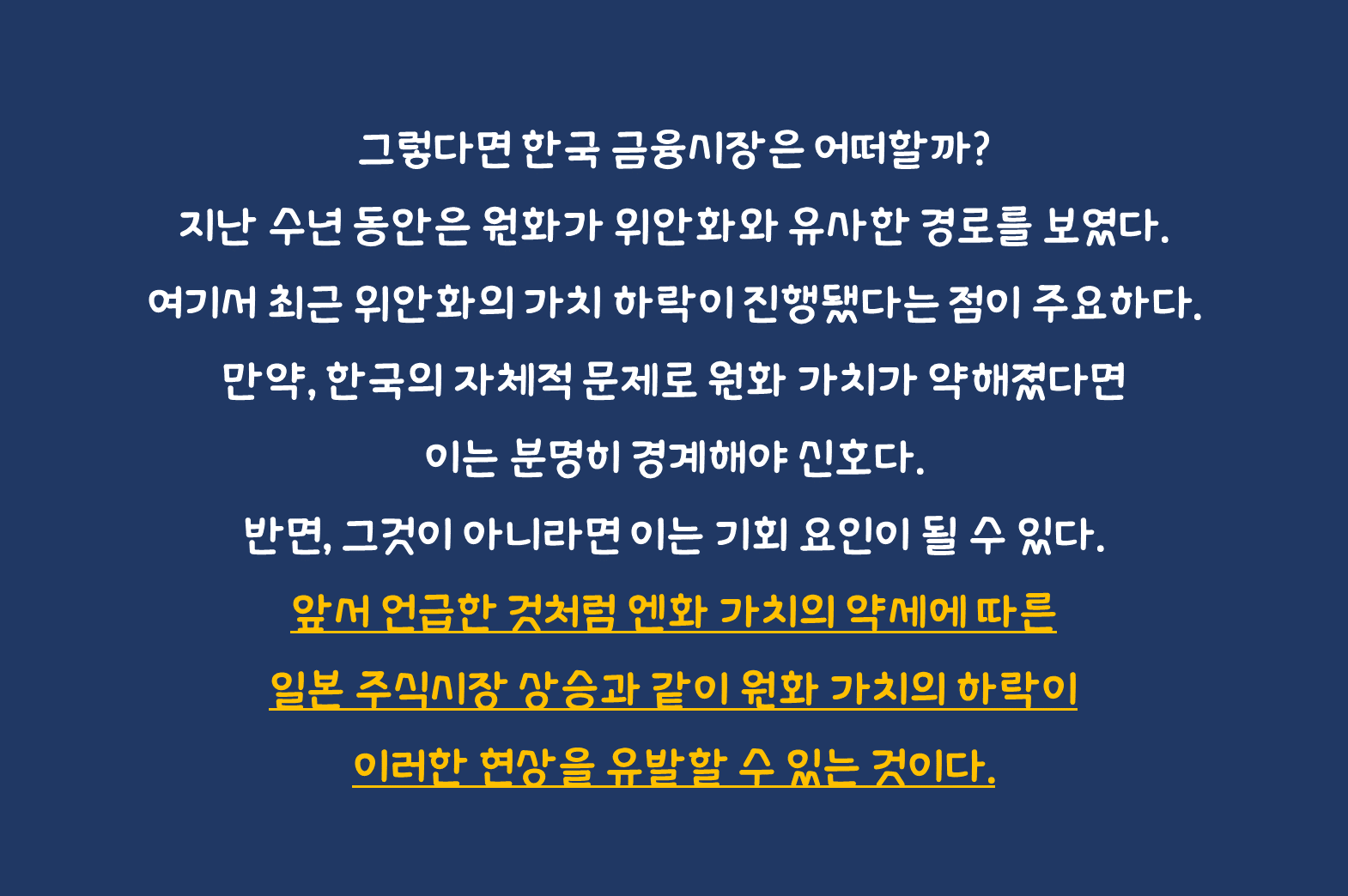 그렇다면 한국 금융시장은 어떠할까? 원화는 한국과 주요국 간의 통화정책 차이에 대한 반응의 정도가 크지 않다. 그보다는 주요국의 통화 가치와 연동하여 움직이는 경향이 있다. 지난 수년 동안은 원화가 위안화와 유사한 경로를 보였다. 여기서 최근 위안화의 가치 하락이 진행됐다는 점이 주요하다. 주지하다시피 이는 얼마 전 불거진 중국의 부동산 위기에 기인한다. 이에 원화 가치가 함께 하락했다. 만약, 한국의 자체적 문제로 원화 가치가 약해졌다면 이는 분명히 경계해야 신호다. 반면, 그것이 아니라면 이는 기회 요인이 될 수 있다. 앞서 언급한 것처럼 엔화 가치의 약세에 따른 일본 주식시장 상승과 같이 원화 가치의 하락이 이러한 현상을 유발할 수 있는 것이다.