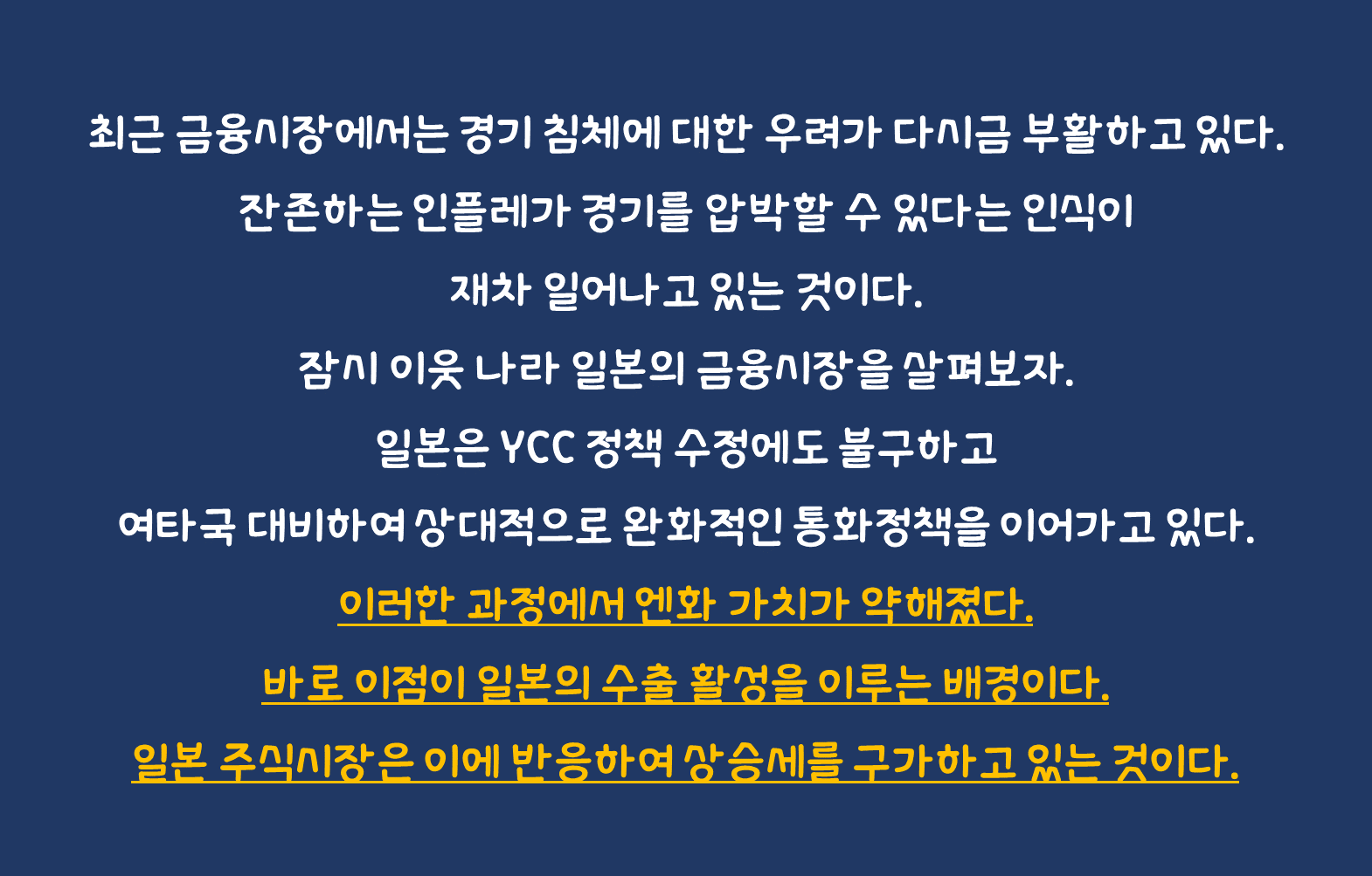 잠시 이웃 나라 일본의 금융시장을 살펴보자. 일본은 YCC 정책 수정에도 불구하고 여타국 대비하여 상대적으로 완화적인 통화정책을 이어가고 있다. 일반적으로 환율은 각국 간 통화정책의 차이에 반응한다. 선진국 통화일수록 이에 대한 효과는 더욱 뚜렷해진다. 이러한 과정에서 엔화 가치가 약해졌다. 특히 지금은 잔존하는 인플레 환경에서 저렴한 물품을 구매하고자 하는 소비자들의 욕구가 상당하다. 엔화와 연동하는 일본의 수출품이 글로벌 소비자들에게 매력적으로 다가오는 이유가 여기에 있었다. 바로 이점이 일본의 수출 활성을 이루는 배경이다. 일본 주식시장은 이에 반응하여 상승세를 구가하고 있는 것이다.