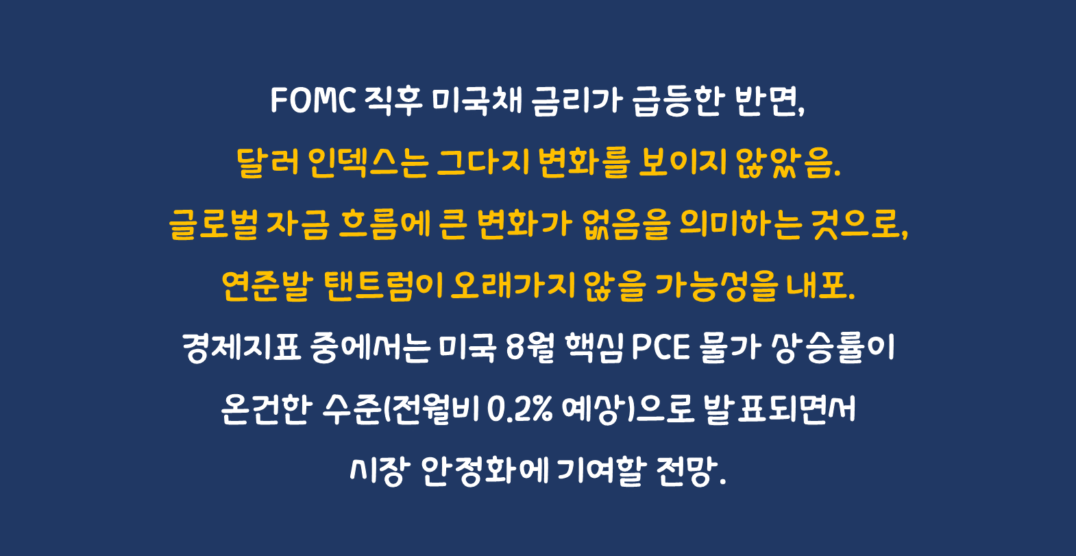 [Check Points & Strategies] FOMC 직후 미국채 금리가 급등한 반면, 달러 인덱스는 그다지 변화를 보이지 않았음. 글로벌 자금 흐름에 큰 변화가 없음을 의미하는 것으로, 연준발 탠트럼이 오래가지 않을 가능성을 내포. 관련해서, 다음주(9/25~9/29) 파월 의장을 포함해서 FOMC 멤버들 다수의 공개 발언에 주목할 필요가 있음. 경제지표 중에서는 미국 8월 핵심 PCE 물가 상승률이 온건한 수준(전월비 0.2% 예상)으로 발표되면서 시장 안정화에 기여할 전망.
