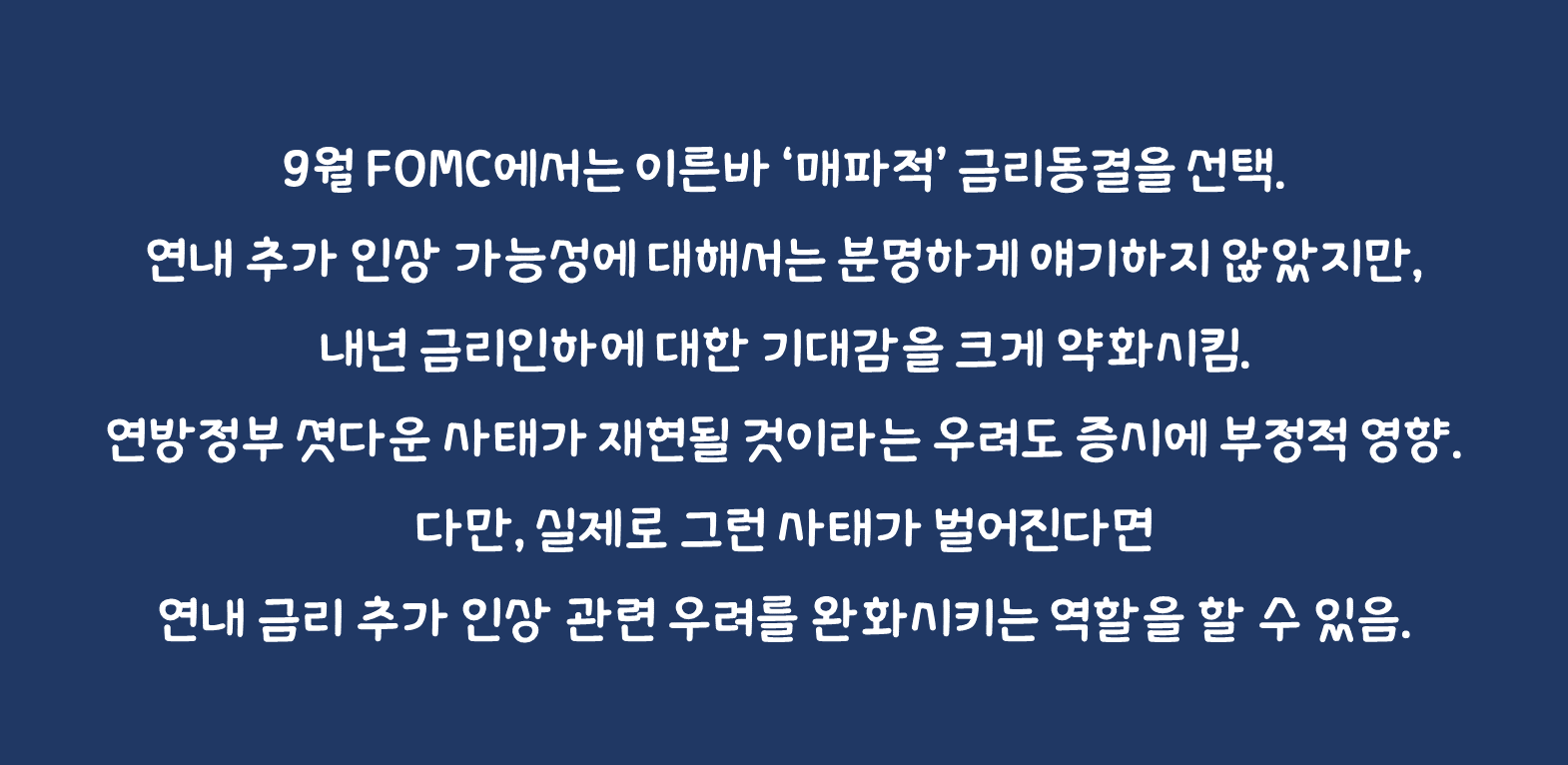 [Market Issues] 9월 FOMC에서는 이른바 ‘매파적’ 금리동결을 선택. 연내 추가 인상 가능성에 대해서는 분명하게 얘기하지 않았지만, 내년 금리인하에 대한 기대감을 크게 약화시킴. 기존(3개월전) 점도표에서는 2024년 네 차례까지 금리인하를 기대하게 했으나, 이번 점도표에서는 두 차례 정도로 금리인하 예상이 변한 것. 아울러, 2024년 경제 성장률 전망치도 상향. 이에, 8월 이후 상승세가 지속되던 미국채 금리는 FOMC 직후 상승 폭이 확대되었으며, 글로벌 증시에 성장주 중심으로 조정을 야기. 또, 미국 내년 예산안 합의가 잘 안 돼서 연방정부 셧다운 사태가 재현될 것이라는 우려도 증시에 부정적 영향. 다만, 연방정부 셧다운과 관련해서는, 경험적으로 주가에 유의미한 영향을 미치지 않아 왔기 때문에 크게 우려하지 않음. 오히려, 실제로 그런 사태가 벌어진다면 연내 금리 추가 인상 관련 우려를 완화시키는 역할을 할 수 있음.