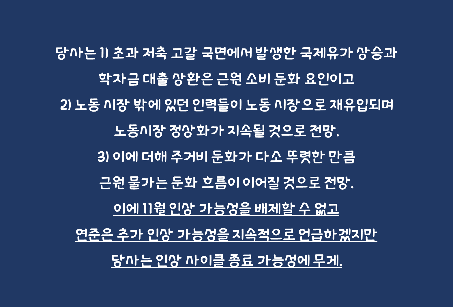 당사는 1) 초과 저축 고갈 국면에서 발생한 국제유가 상승과 학자금 대출 상환은 근원 소비 둔화 요인이고 2) 노동 시장 밖에 있던 인력들이 노동 시장으로 재유입되며 노동시장 정상화가 지속될 것으로 전망. 3) 이에 더해 주거비 둔화가 다소 뚜렷한 만큼 근원 물가는 둔화 흐름이 이어질 것으로 전망. 이에 11월 인상 가능성을 배제할 수 없고 연준은 추가 인상 가능성을 지속적으로 언급하겠지만 당사는 인상 사이클 종료 가능성에 무게.