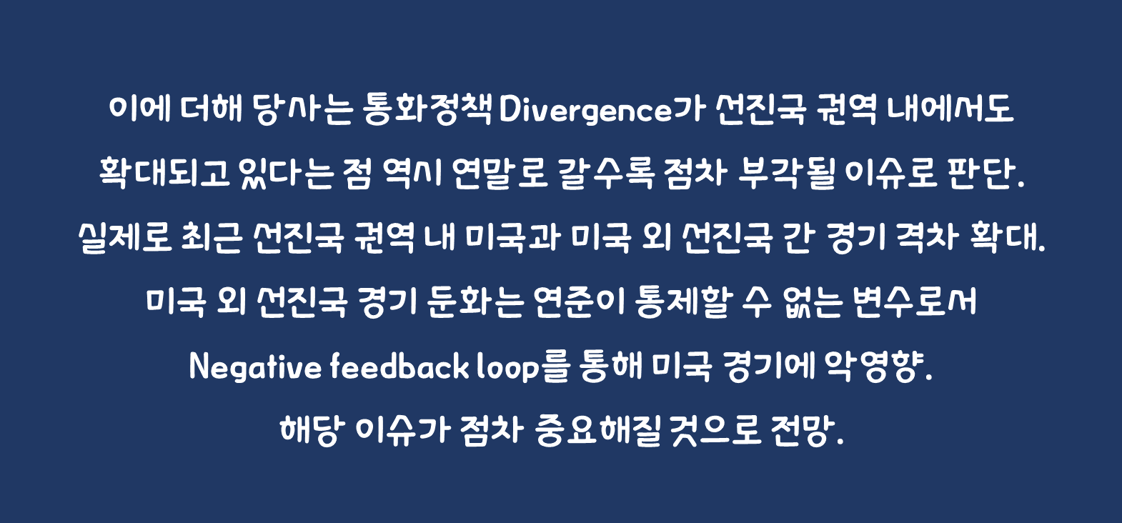 이에 더해 당사는 통화정책 Divergence가 선진국 권역 내에서도 확대되고 있다는 점 역시 연말로 갈수록 점차 부각될 이슈로 판단. 실제로 최근 선진국 권역 내 미국과 미국 외 선진국 간 경기 격차 확대. 독일이 3개분기 연속 (-) 성장이 예상되는 가운데 최근 영국은 영란은행의 예상보다 가파른 실업률 상승이 진행 중. 미국 외 선진국 경기 둔화는 연준이 통제할 수 없는 변수로서 Negative feedback loop를 통해 미국 경기에 악영향. 해당 이슈가 점차 중요해질 것으로 전망.