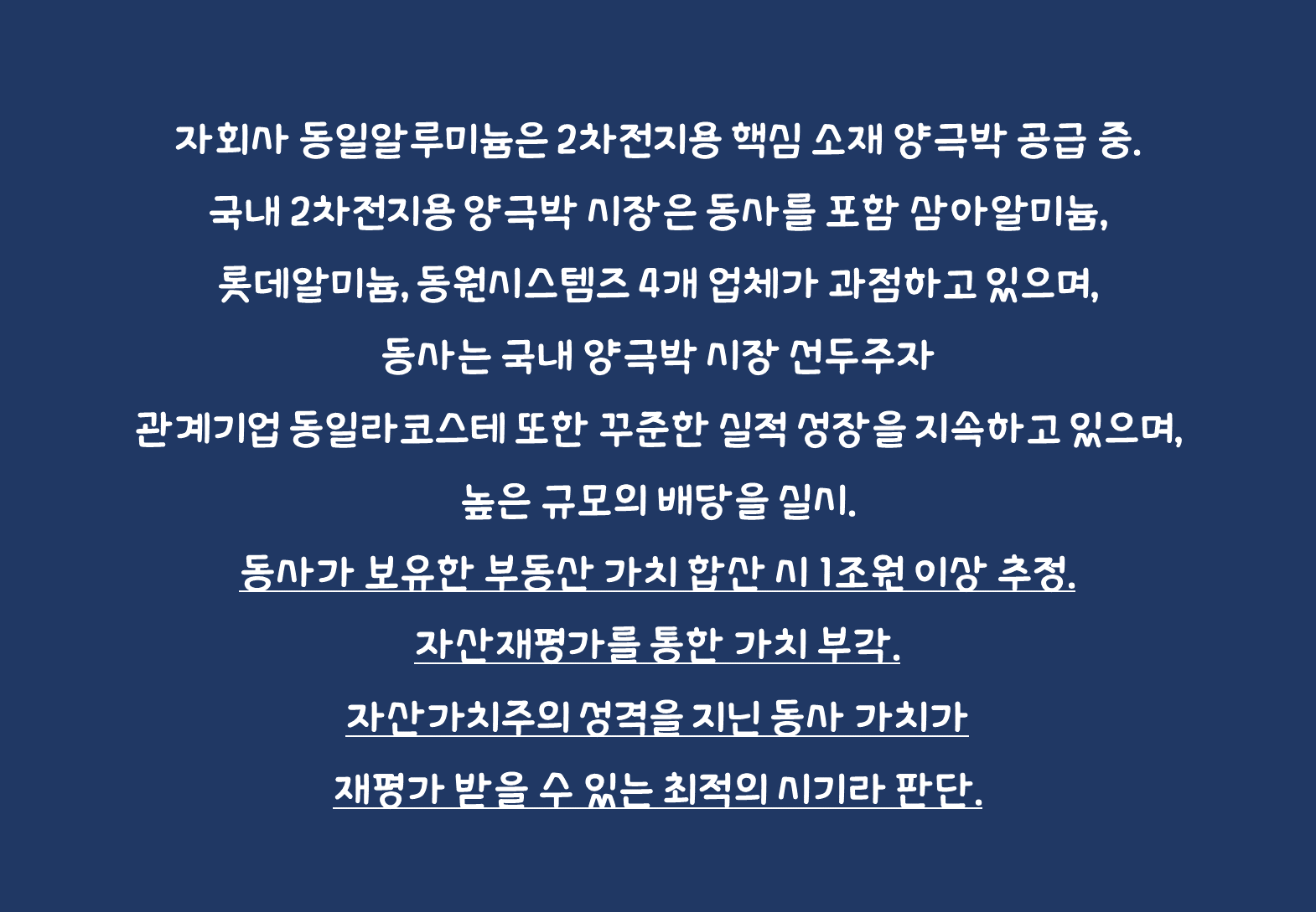자회사 동일알루미늄은 2차전지용 핵심 소재 양극박 공급 중. 국내 2차전지용 양극박 시장은 동사를 포함 삼아알미늄, 롯데알미늄, 동원시스템즈 4개 업체가 과점하고 있으며, 동사는 국내 양극박 시장 선두주자로 경쟁사 삼아알미늄(시가총액 1.4조원) 대비 높은 영업이익을 시현하고 있어 지분 가치 재평가 기대.