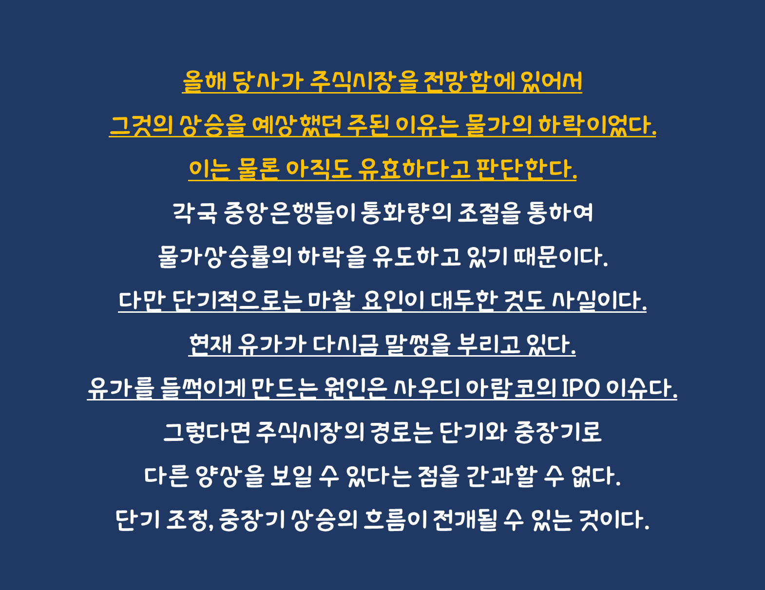 올해 당사가 주식시장을 전망함에 있어서 그것의 상승을 예상했던 주된 이유는 물가의 하락이었다. 이는 물론 아직도 유효하다고 판단한다. 각국 중앙은행들이 통화량의 조절을 통하여 물가상승률의 하락을 유도하고 있기 때문이다. 다만 단기적으로는 마찰 요인이 대두한 것도 사실이다. 현재 유가가 다시금 말썽을 부리고 있다. 유가를 들썩이게 만드는 원인은 사우디 아람코의 IPO 이슈다. 사우디는 원유의 공급 조절에 의한 유가상승을 도모하여 IPO에서 유리한 가격을 획득하려는 목적을 가진 것으로 알려져 있다. 그렇다면 주식시장의 경로는 단기와 중장기로 다른 양상을 보일 수 있다는 점을 간과할 수 없다. 단기 조정, 중장기 상승의 흐름이 전개될 수 있는 것이다.