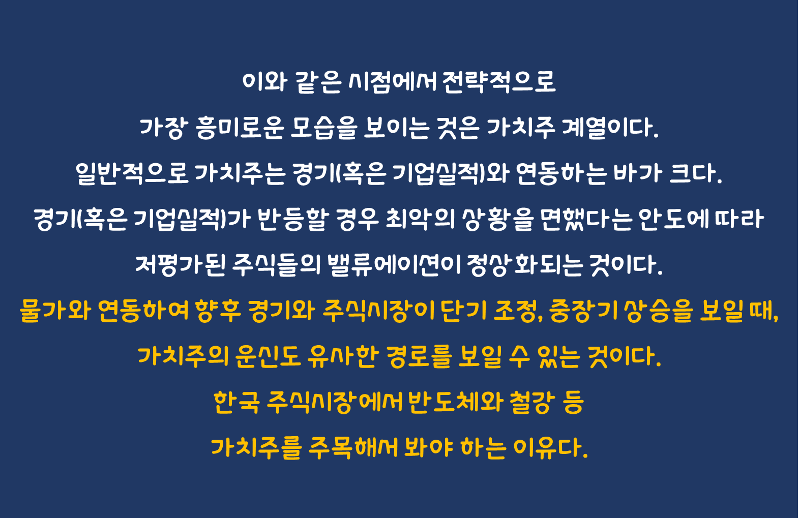 이와 같은 시점에서 전략적으로 가장 흥미로운 모습을 보이는 것은 가치주 계열이다. 일반적으로 가치주는 경기(혹은 기업실적)와 연동하는 바가 크다. 경기(혹은 기업실적)가 반등할 경우 최악의 상황을 면했다는 안도에 따라 저평가된 주식들의 밸류에이션이 정상화되는 것이다. 지금 가치주는 그 자체로도 저평가된 것은 물론이거니와 여타의 스타일 전략 대비해서도 저평가된 정도가 크다. 물가와 연동하여 향후 경기와 주식시장이 단기 조정, 중장기 상승을 보일 때, 가치주의 운신도 유사한 경로를 보일 수 있는 것이다. 한국 주식시장에서 반도체와 철강 등 가치주를 주목해서 봐야 하는 이유다.