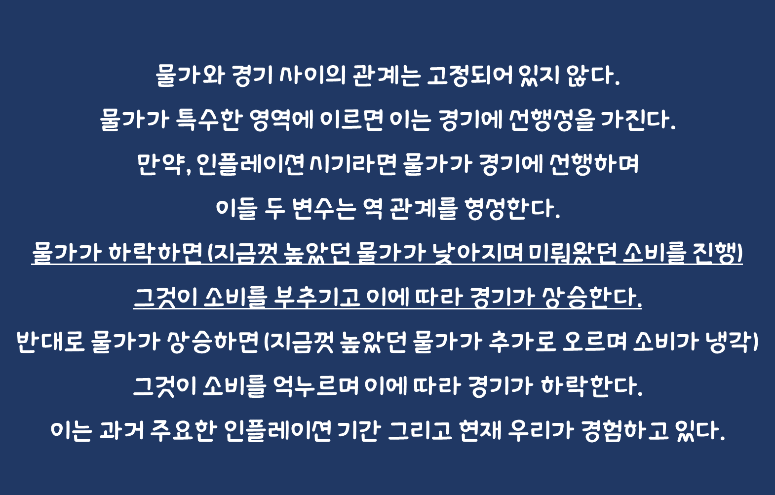 만약, 인플레이션 시기라면 물가가 경기에 선행하며 이들 두 변수는 역 관계를 형성한다. 물가가 하락하면 (지금껏 높았던 물가가 낮아지며 미뤄왔던 소비를 진행) 그것이 소비를 부추기고 이에 따라 경기가 상승한다. 반대로 물가가 상승하면 (지금껏 높았던 물가가 추가로 오르며 소비가 냉각) 그것이 소비를 억누르며 이에 따라 경기가 하락한다. 이는 과거 주요한 인플레이션 기간 그리고 현재 우리가 경험하고 있다.
