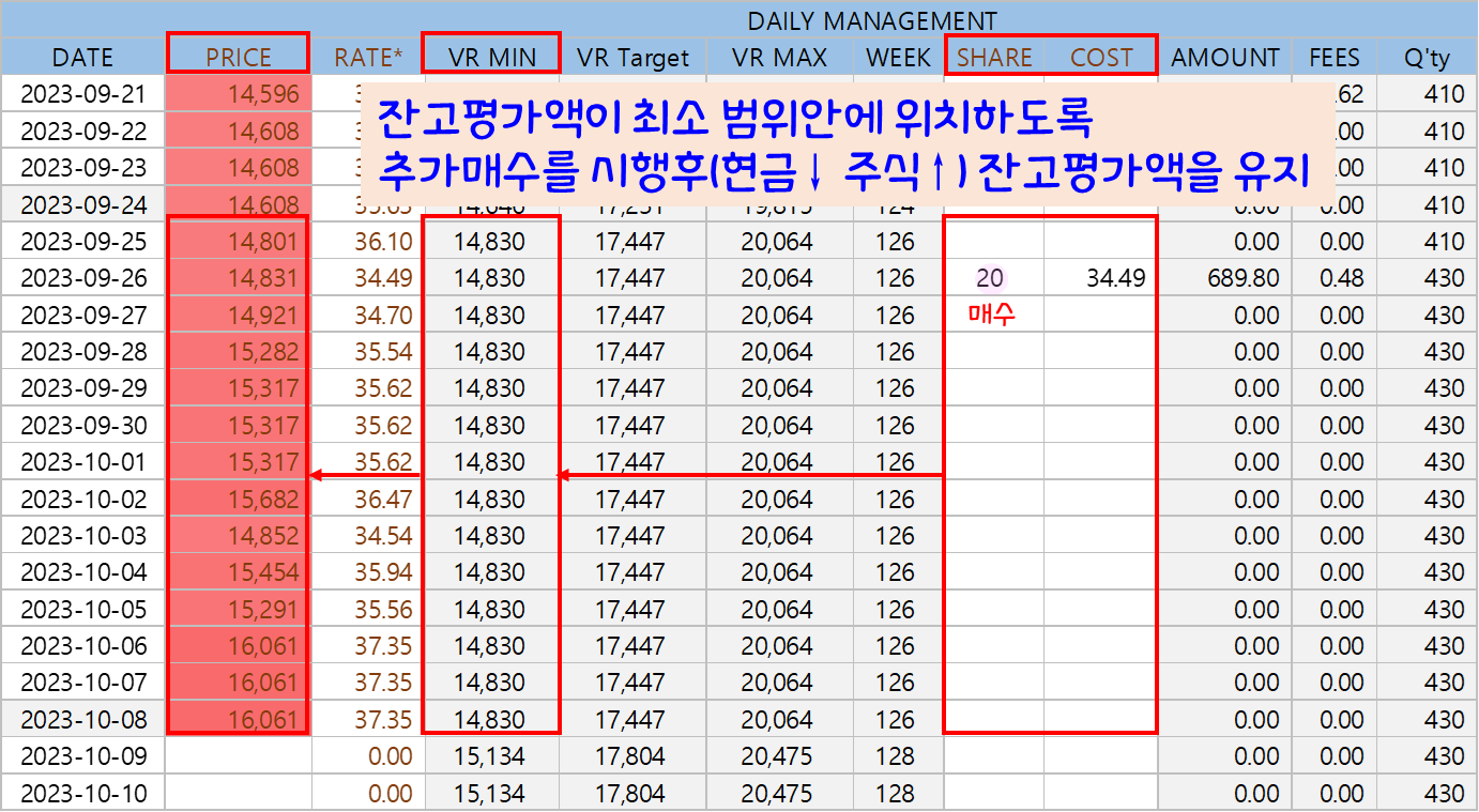 주머니(Pool)를 별도 하나 만들어 두고 매월 일정 금액을 꾸준히 주머니(Pool)에 적립하고, 평가액이 목표 value보다 낮으면 주머니(Pool)에서 투자금을 꺼내 추가 매수하여 목표 value에 맞추고, 반대로 평가액이 목표 value보다 크다면 일부 매도하여 목표 value에 맞춤과 동시에 수익은 주머니(Pool)에 다시 넣어두고 추후 매수에 사용할 수 있도록 여력을 비축하는 거였어요.