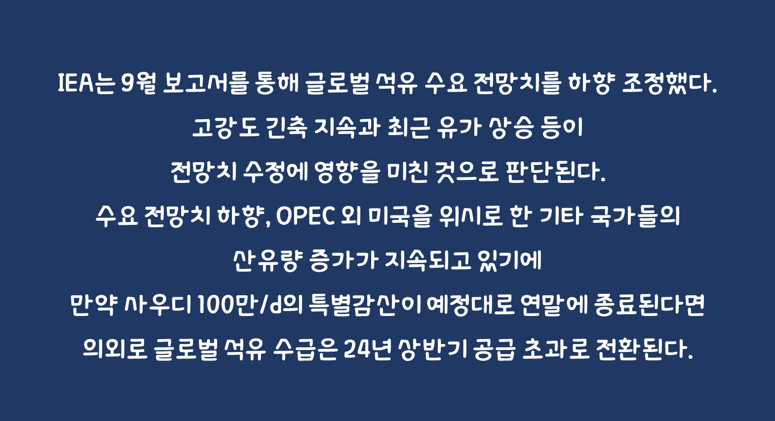 IEA 9월 보고서, 23년 하반기~24년 상반기 수요 전망치 하향 조정: