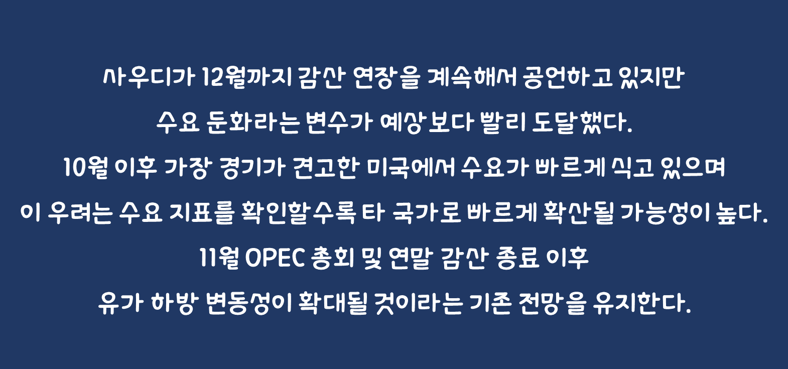 사우디가 12월까지 감산 연장을 계속해서 공언하고 있지만 수요 둔화라는 변수가 예상보다 빨리 도달했다. 카르텔 사업 환경에서 공급 조절 효과가 극대화될 수 있는 것은 수요가 견고할 때다. 하지만 10월 이후 가장 경기가 견고한 미국에서 수요가 빠르게 식고 있으며 이 우려는 수요 지표를 확인할수록 타 국가로 빠르게 확산될 가능성이 높다. 감산 계획이 바뀌지 않은 상황에서 수요 요인으로 이미 변동성이 확대된 유가는 공급 변화가 가미될 때 변동성을 더욱 키울 가능성이 있다. 11월 OPEC 총회 및 연말 감산 종료 이후 유가 하방 변동성이 확대될 것이라는 기존 전망을 유지한다.