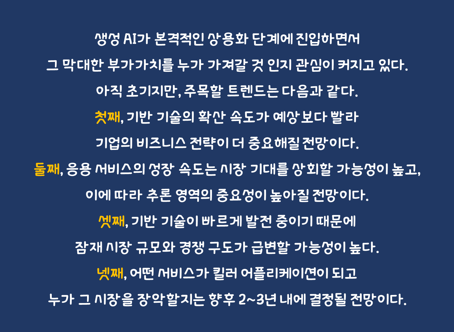 생성 AI가 본격적인 상용화 단계에 진입하면서 그 막대한 부가가치를 누가 가져갈 것 인지 관심이 커지고 있다. 인터넷/모바일 혁명을 되돌아보면 향후 2~3년 내에 승자가 결정될 가능성이 높다. 아직 초기지만, 주목할 트렌드는 다음과 같다.