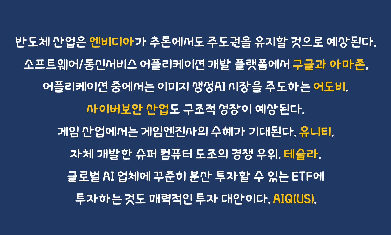 생성 AI에 따른 응용 서비스 시장 규모가 급증하는 가운데 막대한 부가가치가 창출되고 이를 소수의 승자가 가져갈 것이라는 점은 분명하지만, 그 승자가 구체적으로 누가 될지는 향후 2~3년 내에 결정될 가능성이 높다. 인터넷 시대의 구글과 아마존, 모바일 시대의 메타와 트위터 등과 같이 생성 AI 시대의 주인공이 누가 될지 계속 찾아 나갈 필요가 있지만 그와 함께 글로벌 AI 업체에 꾸준히 분산 투자할 수 있는 ETF에 투자하는 것도 매력적인 투자 대안이다.