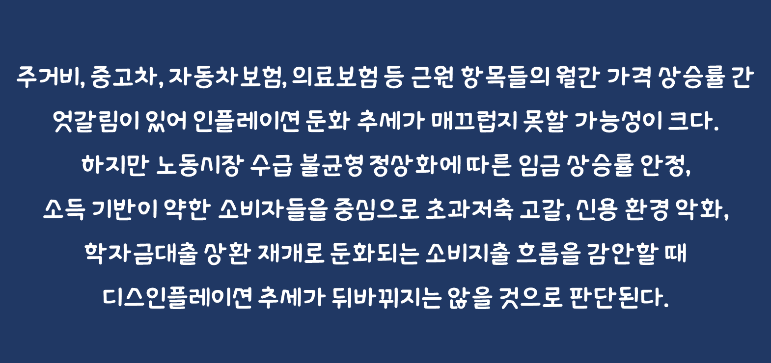 연준이 인플레이션 모멘텀을 측정하는 데 사용하는 지표인 월간 3개월 및 6개월 단위 근원 CPI의 연환산 증가율은 디스인플레이션 추세가 유효함을 나타내고 있다. 월간 및 3개월 단위 연환산 증가율은 8월보다 반등했지만(월간: 3.4% 3.9%, 3개월 2.4% 3.1%) 6개월 단위 연환산 증가율은 8월 3.7%, 9월 3.6%로 둔화됐다. 보다 긴 호흡에서의 디스플레이션 추세는 유지되고 있다고 본다. 앞으로도 주거비, 중고차, 자동차보험, 의료보험 등 근원 항목들의 월간 가격 상승률 간 엇갈림이 있어 인플레이션 둔화 추세가 매끄럽지 못할 가능성이 크다. 기저효과로 7~9월 전년 대비 근원인플레이션은 헤드라인과 반대로 뚜렷한 둔화를 보여주었지만 10~11월은 정체되거나 오히려 소폭 상승할 가능성도 있다. 12월 CPI가 발표될 내년 초에야 3%대 근원인플레이션을 확인할 수 있을 것이다. 하지만 노동시장 수급 불균형 정상화에 따른 임금 상승률 안정, 소득 기반이 약한 소비자들을 중심으로 초과저축 고갈, 신용 환경 악화, 학자금대출 상환 재개로 둔화되는 소비지출 흐름을 감안할 때 디스인플레이션 추세가 뒤바뀌지는 않을 것으로 판단된다. 그에 따라 내년 2분기 경 전년 대비 근원 CPI는 2%대에 진입할 수 있다.