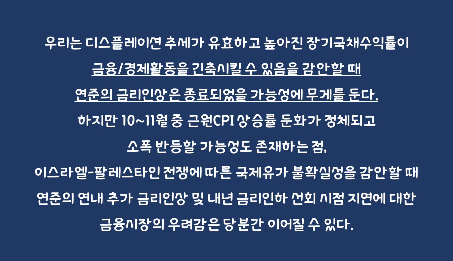 우리는 디스플레이션 추세가 유효하고 높아진 장기국채수익률이 금융/경제활동을 긴축시킬 수 있음을 감안할 때 연준의 금리인상은 종료되었을 가능성에 무게를 둔다. 하지만 10~11월 중 근원CPI 상승률 둔화가 정체되고 소폭 반등할 가능성도 존재하는 점, 이스라엘-팔레스타인 전쟁에 따른 국제유가 불확실성을 감안할 때 연준의 연내 추가 금리인상 및 내년 금리인하 선회 시점 지연에 대한 금융시장의 우려감은 당분간 이어질 수 있다.