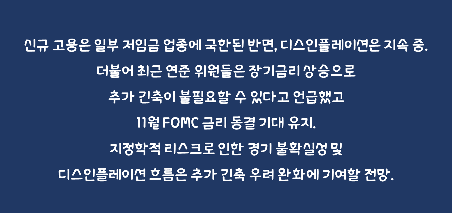 코어 인플레, 임금 상승세 둔화 및 연준 일부 구성원의 스탠스 변화 확인. 11월 동결 기대 유지
