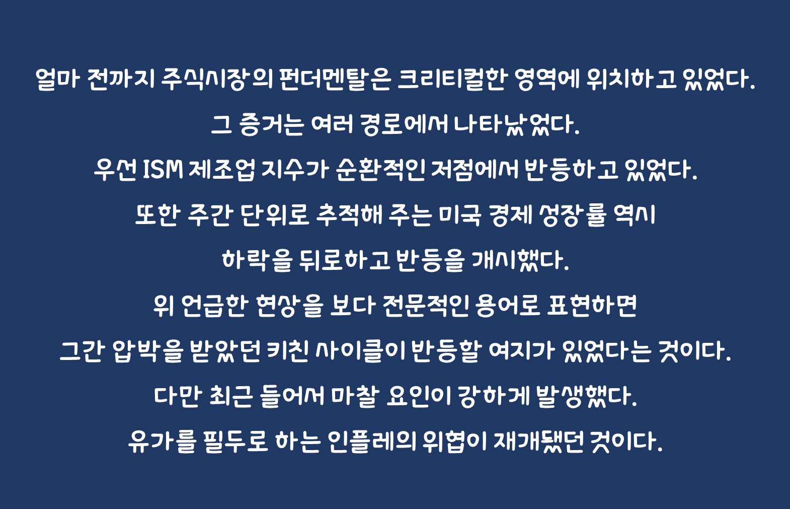 즉, 지금 주식시장을 정리해 보면 다음과 같다. 당초 주식시장의 기저에 있는 키친 사이클이 순환적인 저점에서 반등할 수 있다는 기대가 있었다. 그러나 원유 시장을 중심으로 일련의 사태가 나타나며 물가상승률 하락에 대한 신뢰가 흐려졌다. 이로 말미암아 통화정책 전환에 문제가 발생할 수 있다는 의견이 대두하며 키친 사이클의 반등이 요원하다는 대중 인식이 확산한 것이다.