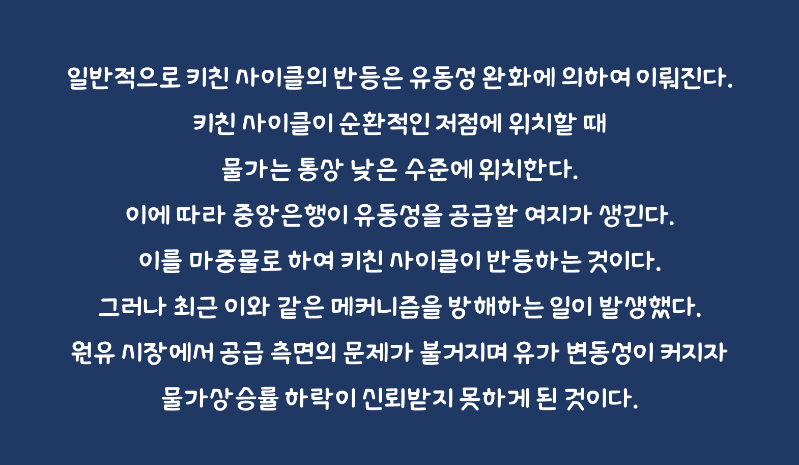 일반적으로 키친 사이클의 반등은 유동성 완화에 의하여 이뤄진다. 키친 사이클이 순환적인 저점에 위치할 때 물가는 통상 낮은 수준에 위치한다. 이에 따라 중앙은행이 유동성을 공급할 여지가 생긴다. 이를 마중물로 하여 키친 사이클이 반등하는 것이다. 그러나 최근 이와 같은 메커니즘을 방해하는 일이 발생했다. 원유 시장에서 공급 측면의 문제가 불거지며 유가 변동성이 커지자 물가상승률 하락이 신뢰받지 못하게 된 것이다. 이에 따라 미국 연준을 위시한 중앙은행이 유동성을 더욱 옥죄였다. 연준 인사들의 발언에 시중금리가 추가 급등하는 사태까지 나타났다. 결국 통화정책 전환에 차질이 생길 것이라는 인식으로 키친 사이클의 반등이 이뤄지지 못할 수 있다는 생각이 똬리를 틀게 됐다. 이는 주식시장이 하락하는 현상으로 귀결됐다.