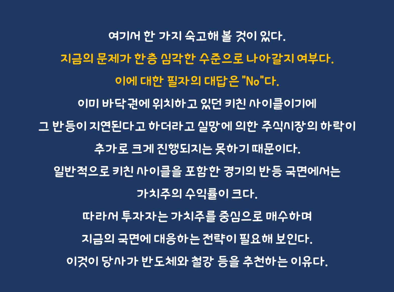 이와 같은 상황에서 투자자의 선택은 간명해진다. 키친 사이클의 반등이 순연됐다면 이를 겨냥하여 이후 국면에서 기대수익률이 높은 주식을 여유를 가지고 매수해 나갈 수 있다. 일반적으로 키친 사이클을 포함한 경기의 반등 국면에서는 가치주의 수익률이 크다. 따라서 투자자는 가치주를 중심으로 매수하며 지금의 국면에 대응하는 전략이 필요해 보인다. 이것이 당사가 반도체와 철강 등을 추천하는 이유다.