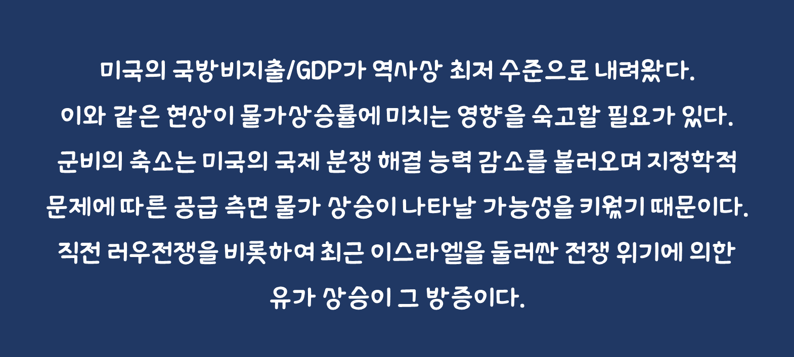 ✅ 미국의 국방비지출/GDP가 역사상 최저 수준으로 내려왔다. 과거 소련과의 체제 경쟁 시기에 미국은 GDP 대비하여 최대 9%의 국방비를 지출했었다. 이것이 소련의 붕괴 이후 내려오기 시작하더니 현재는 GDP 대비 3% 내외 수준에 머물고 있다. 이와 같은 현상이 물가상승률에 미치는 영향을 숙고할 필요가 있다. 군비의 축소는 미국의 국제 분쟁 해결 능력 감소를 불러오며 지정학적 문제에 따른 공급 측면 물가 상승이 나타날 가능성을 키웠기 때문이다. 직전 러우전쟁을 비롯하여 최근 이스라엘을 둘러싼 전쟁 위기에 의한 유가 상승이 그 방증이다.