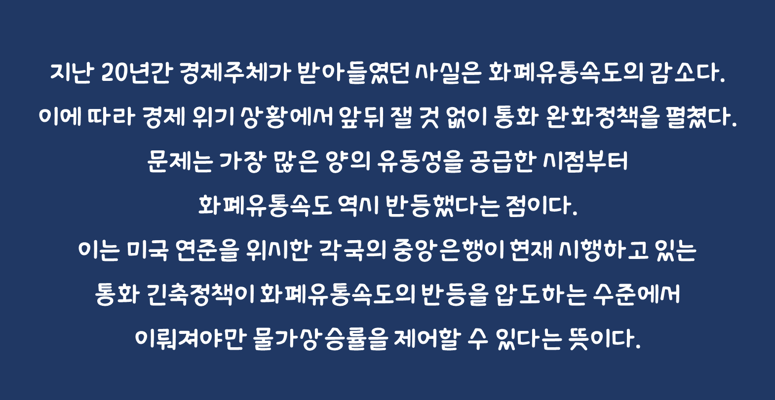 ✅ 2020년을 기점으로 화폐유통속도가 빠르게 반등하고 있다. 지난 20년간 경제주체가 받아들였던 사실은 화폐유통속도의 감소다. 이에 따라 경제 위기 상황에서 앞뒤 잴 것 없이 통화 완화정책을 펼쳤다. 문제는 가장 많은 양의 유동성을 공급한 시점부터 화폐유통속도 역시 반등했다는 점이다. 팬데믹 당시 실행한 무제한 양적완화가 화폐유통속도의 반등과 만나 물가를 자극한 것이다. 이는 미국 연준을 위시한 각국의 중앙은행이 현재 시행하고 있는 통화 긴축정책이 화폐유통속도의 반등을 압도하는 수준에서 이뤄져야만 물가상승률을 제어할 수 있다는 뜻이다.