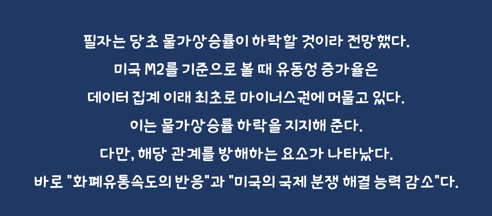 중동 지역의 지정학적 리스크 확대와 더불어 유가가 다시금 상승하고 있다. 최근 주식시장의 지배적 요인인 인플레에 대하여 우려가 커지는 것이다. 그 점검이 필요한 때다. 필자는 당초 물가상승률이 하락할 것이라 전망했다. 큰 틀에서 보면 물가상승률은 유동성 증가율에 연동하여 움직인다는 기본적인 이론이 작동할 것이라 판단했기 때문이다. 미국 M2를 기준으로 볼 때 유동성 증가율은 데이터 집계 이래 최초로 마이너스권에 머물고 있다. 이는 물가상승률 하락을 지지해 준다. 다만, 해당 관계를 방해하는 요소가 나타났다. 바로 "화폐유통속도의 반응"과 "미국의 국제 분쟁 해결 능력 감소"다.