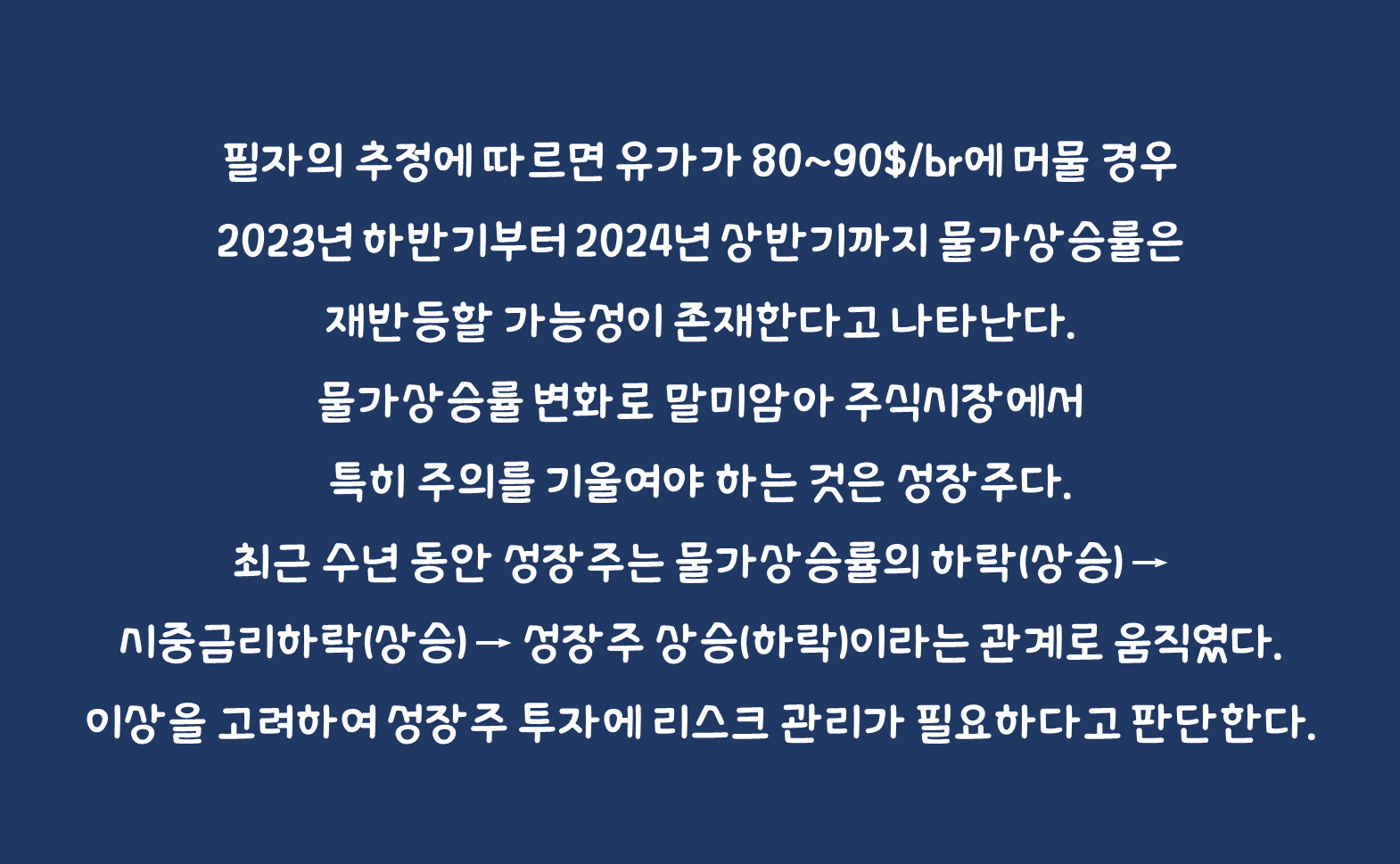 유가에 대한 일정한 가정 아래에서 물가상승률을 가늠해 보면 다소 흥미로운 결과가 도출된다. 필자의 추정에 따르면 유가가 80~90$/br에 머물 경우 2023년 하반기부터 2024년 상반기까지 물가상승률은 재반등할 가능성이 존재한다고 나타난다. 물가상승률 변화로 말미암아 주식시장에서 특히 주의를 기울여야 하는 것은 성장주다. 최근 수년 동안 성장주는 물가상승률의 하락(상승) → 시중금리하락(상승) → 성장주 상승(하락)이라는 관계로 움직였다. 만일이기는 하지만 본고에서 언급한 내용을 참고할 경우 물가상승률 상승에 의하여 성장주가 적극적으로 오를 수 있는 가능성에 마찰 요소가 발생한다. 이상을 고려하여 성장주 투자에 리스크 관리가 필요하다고 판단한다.