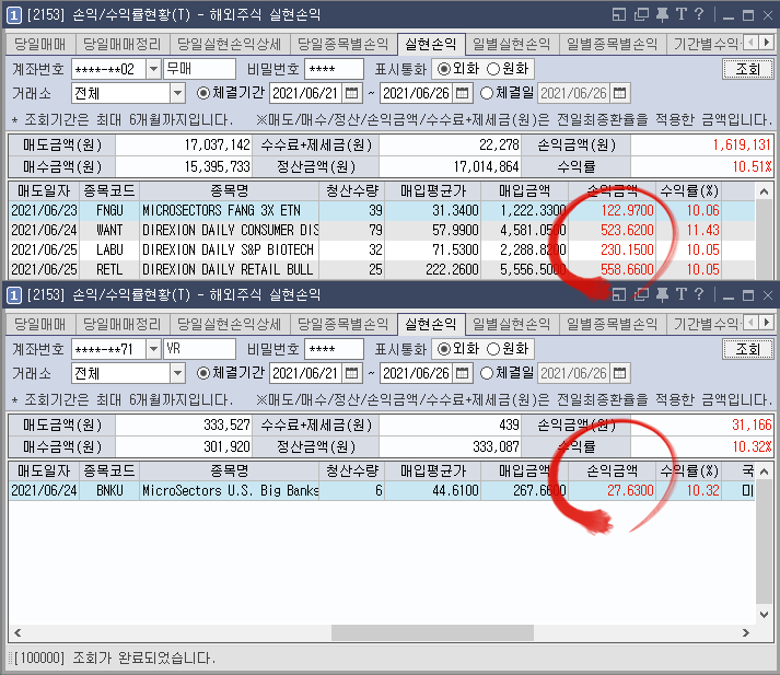 1) 6월 넷째 주입니다. 시작이 좋았습니다. 6/23 FNGU, 6/24 BNKU, WANT를 매도했고, 6/25 LABU와 RETL을 매도했습니다.